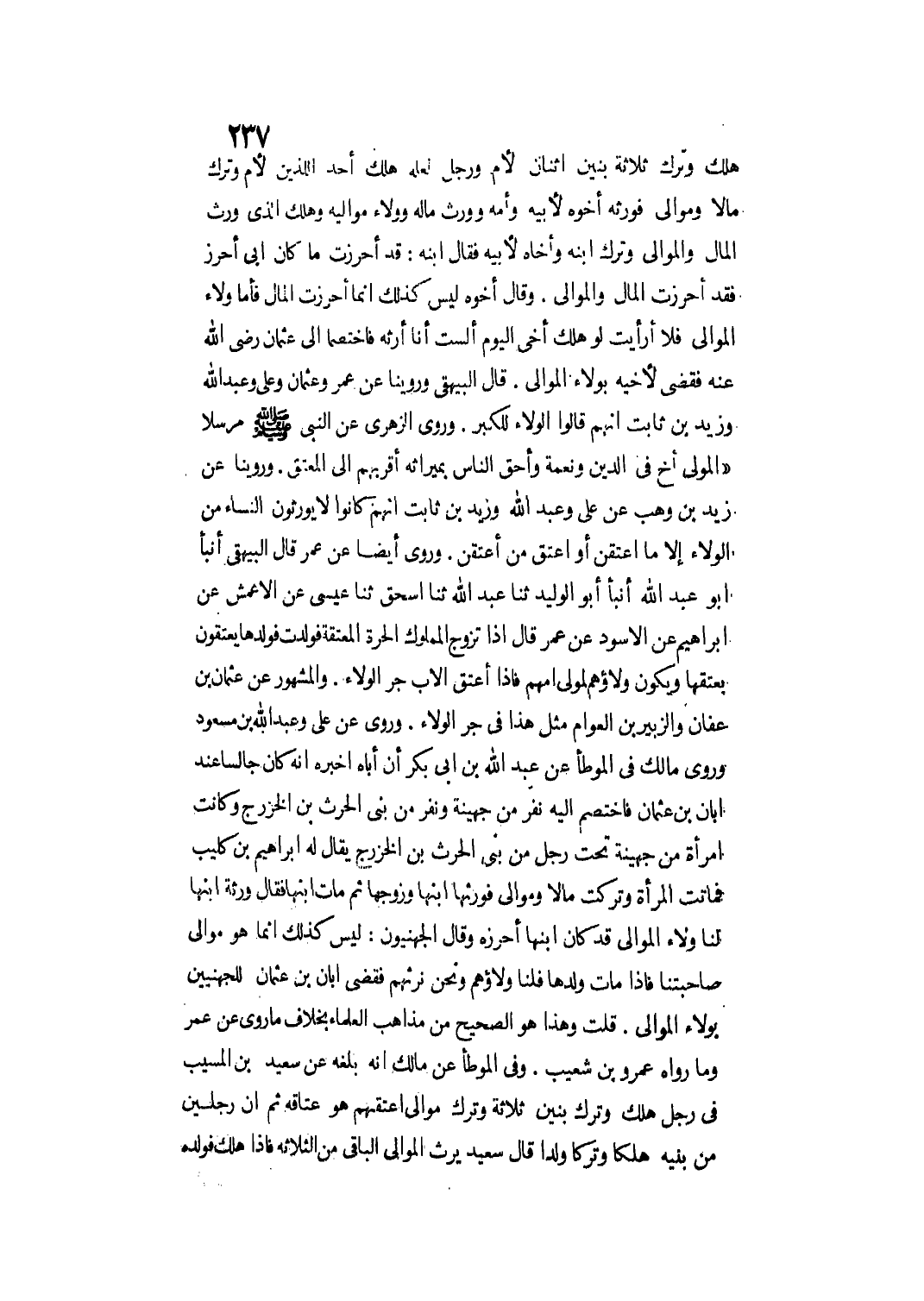 هَلَكَ وَتَرَكَ ثَلَاثَةَ بَنِينَ اثْنَانِ لِأُمٍّ وَرَجُلٍ لَعَلَّهُ هَلَكَ أَحَدُ اللَّذَيْنِ لِأُمٍّ وَتَرَكَ مَالًا وَمَوَالِيَ فَوَرِثَهُ أَخُوهُ لِأَبِيهِ وَأُمِّهِ وَوَرِثَ مَالَهُ، وَوَلَاءَ مَوَالِيهِ وَهَلَكَ الَّذِي وَرِثَ الْمَالَ وَالْمَوَالِيَ وَتَرَكَ ابْنَهُ وَأَخَاهُ لِأَبِيهِ، فَقَالَ ابْنُهُ: قَدْ أَحْرَزْت مَا كَانَ أَبِي أَحْرَزَ فَقَدْ أَحْرَزْت الْمَالَ وَالْمَوَالِيَ. وَقَالَ أَخُوهُ: لَيْسَ كَذَلِكَ إنَّمَا أَحْرَزْت الْمَالَ فَأَمَّا وَلَاءُ الْمَوَالِي فَلَا أَرَأَيْت لَوْ هَلَكَ أَخِي الْيَوْمَ أَلَسْت أَنَا أَرِثُهُ فَاخْتَصَمَا إلَى عُثْمَانَ - رَضِيَ اللَّهُ عَنْهُ - فَقَضَى لِأَخِيهِ بِوَلَاءِ الْمَوَالِيَ.