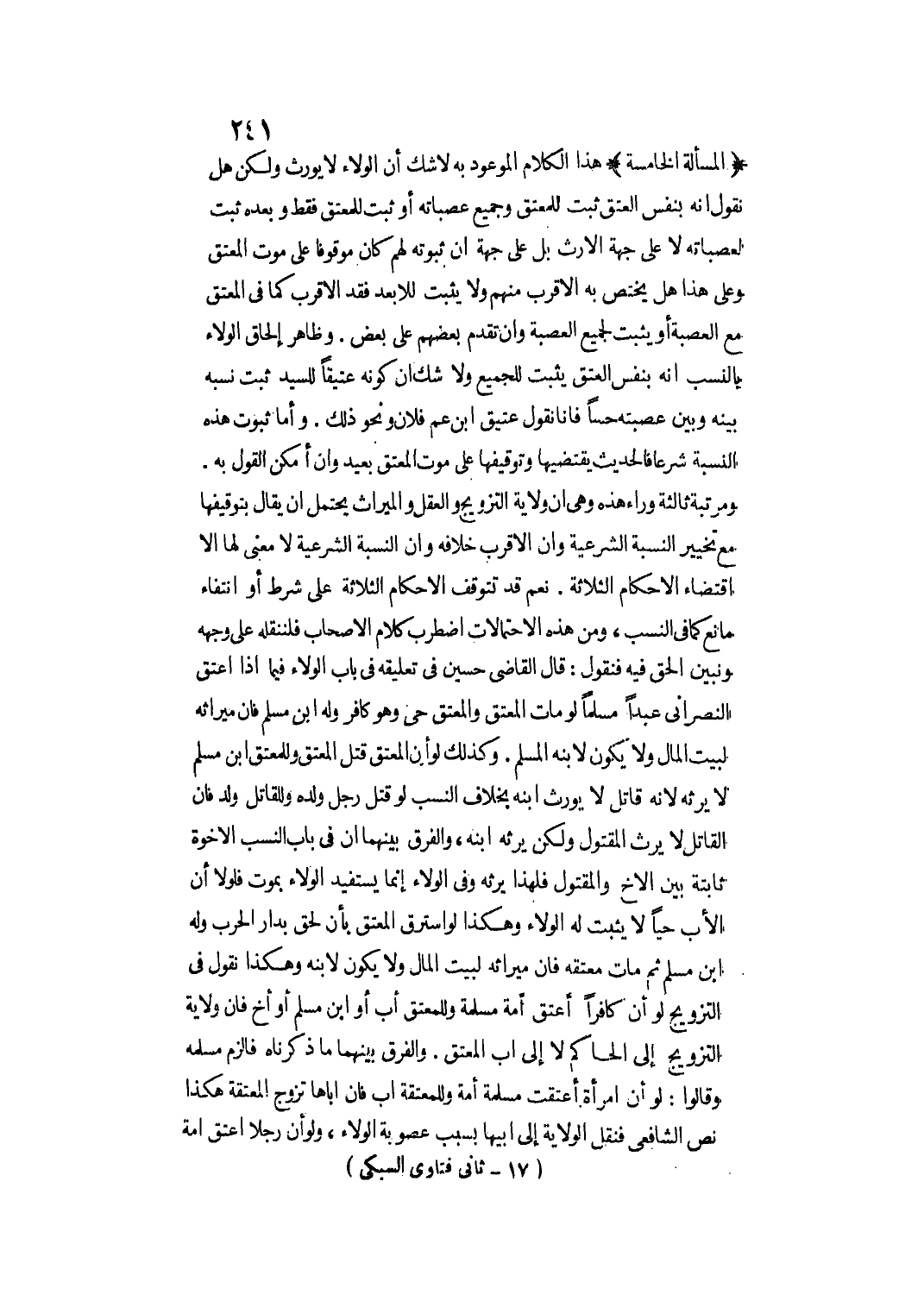الْمَسْأَلَةُ الْخَامِسَةُ} هَذَا الْكَلَامُ الْمَوْعُودُ بِهِ لَا شَكَّ أَنَّ الْوَلَاءَ لَا يُورَثُ وَلَكِنْ هَلْ نَقُولُ: إنَّهُ بِنَفْسِ الْعِتْقِ ثَبَتَ لِلْمُعْتِقِ وَجَمِيعِ عَصَبَاتِهِ أَوْ ثَبَتَ لِلْمُعْتِقِ فَقَطْ وَبَعْدَهُ ثَبَتَ لِعَصَبَاتِهِ لَا عَلَى جِهَةِ الْإِرْثِ بَلْ عَلَى جِهَةِ أَنَّ ثُبُوتَهُ لَهُمْ كَانَ مَوْقُوفًا عَلَى مَوْتِ الْمُعْتِقِ وَعَلَى هَذَا هَلْ يَخْتَصُّ بِهِ الْأَقْرَبُ مِنْهُمْ وَلَا يَثْبُتُ لِلْأَبْعَدِ فَقْدُ الْأَقْرَبِ كَمَا فِي الْمُعْتِقِ مَعَ الْعَصَبَةِ أَوْ يَثْبُتُ لِجَمِيعِ الْعَصَبَةِ وَإِنْ تَقَدَّمَ بَعْضُهُمْ عَلَى بَعْضٍ.