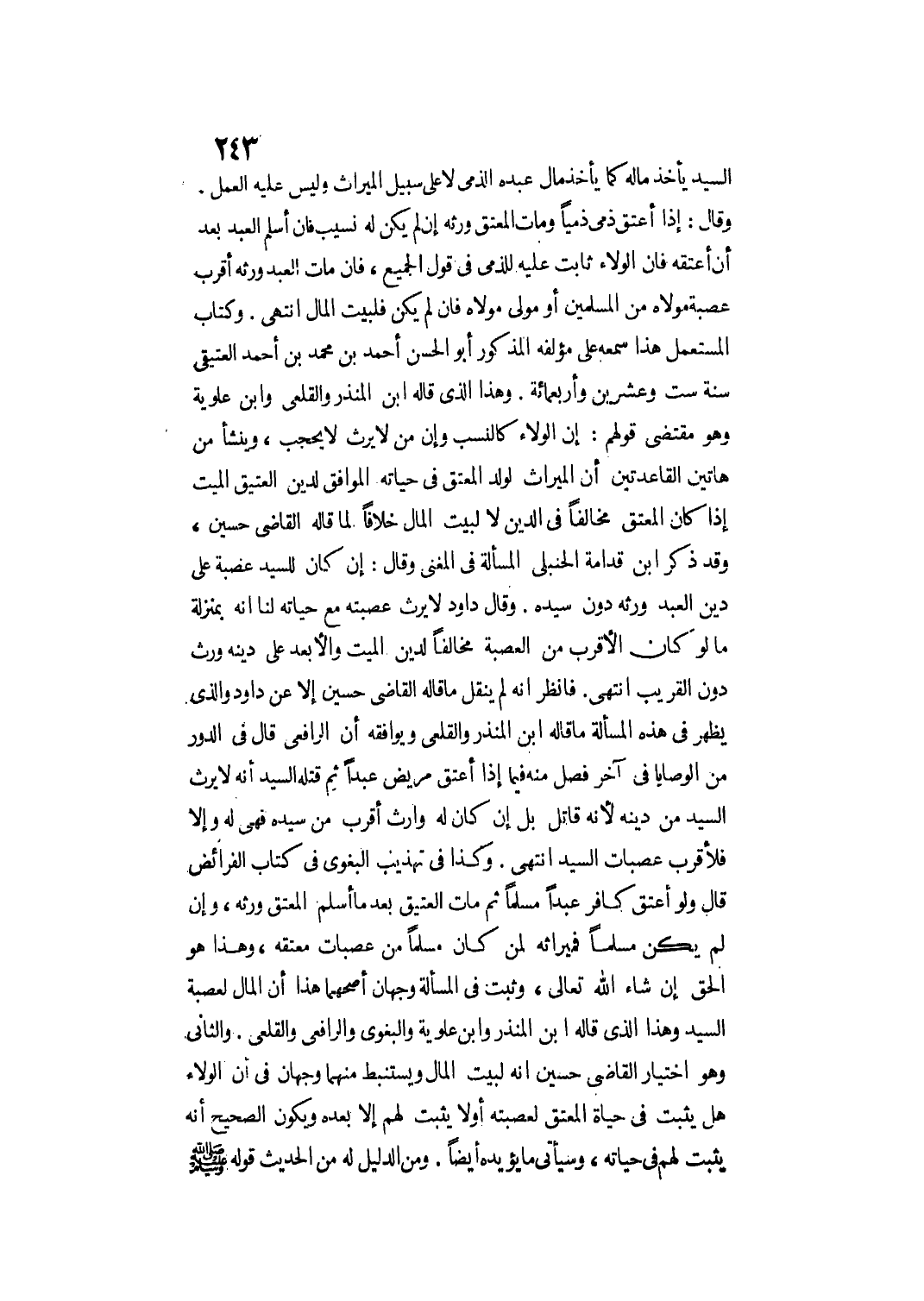 وَكِتَابُ الْمُسْتَعْمَلِ هَذَا سَمِعَهُ عَلَى مُؤَلِّفِهِ الْمَذْكُورِ أَبُو الْحَسَنِ أَحْمَدُ بْنُ مُحَمَّدِ بْنِ أَحْمَدَ الْعَتِيقِيُّ سَنَة سِتٍّ وَعِشْرِينَ وَأَرْبَعِمِائَةٍ وَهَذَا الَّذِي قَالَهُ ابْنُ الْمُنْذِرِ وَالْقَلْعِيُّ وَابْنُ عَلَوِيَّةَ وَهُوَ مُقْتَضَى قَوْلِهِمْ: إنَّ الْوَلَاءَ كَالنَّسَبِ، وَإِنَّ مَنْ لَا يَرِثُ لَا يُحْجَبُ، وَيَنْشَأُ مِنْ هَاتَيْنِ الْقَاعِدَتَيْنِ أَنَّ الْمِيرَاثَ لِوَلَدِ الْمُعْتِقِ فِي حَيَاتِهِ الْمُوَافِقُ لِدَيْنِ الْعَتِيقِ الْمَيِّتِ إذَا كَانَ الْمُعْتِقُ مُخَالِفًا فِي الدِّينِ لَا لِبَيْتِ الْمَالِ خِلَافًا لِمَا قَالَهُ الْقَاضِي حُسَيْنٌ، وَقَدْ ذَكَرَ ابْنُ قُدَامَةَ الْحَنْبَلِيُّ الْمَسْأَلَةَ فِي الْمُغْنِي وَقَالَ: إنْ كَانَ لِلسَّيِّدِ عَصَبَةٌ عَلَى دِينِ الْعَبْدِ وَرِثَهُ دُونَ سَيِّدَهُ.