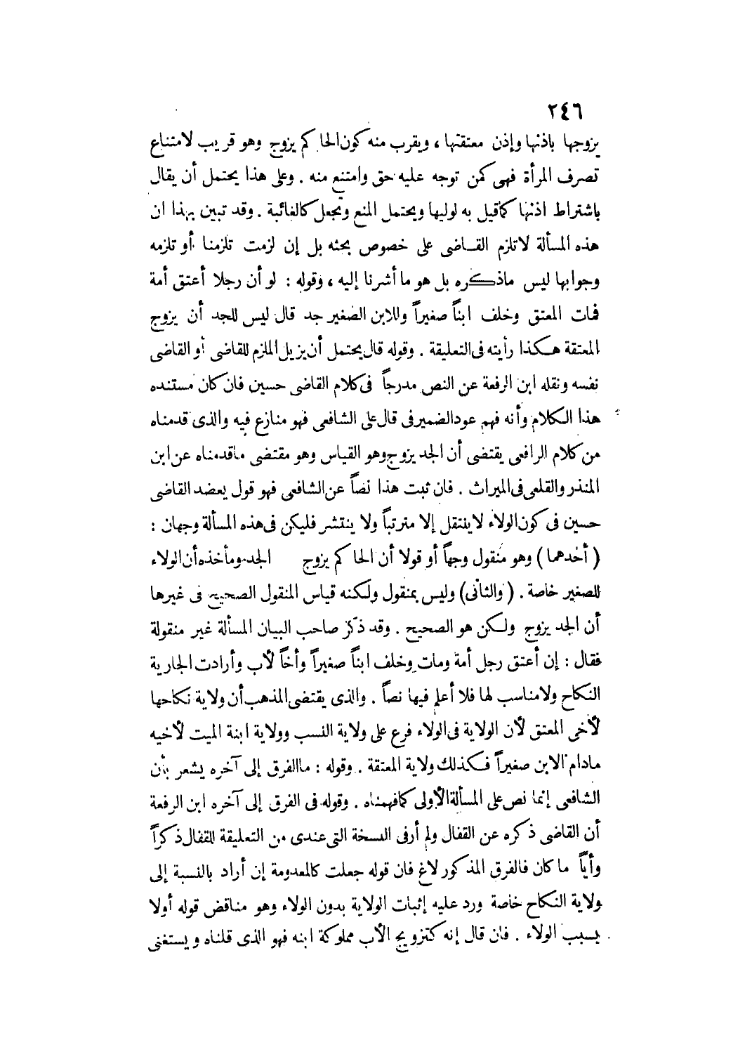 وَقَدْ تَبَيَّنَّ بِهَذَا أَنَّ هَذِهِ الْمَسْأَلَةَ لَا تُلْزِمُ الْقَاضِي عَلَى خُصُوصِ بَحْثِهِ بَلْ إنْ لَزِمَتْ تَلْزَمُنَا أَوْ تَلْزَمُهُ وَجَوَابُهَا لَيْسَ مَا ذَكَرَهُ بَلْ هُوَ مَا أَشَرْنَا إلَيْهِ، وَقَوْلُهُ: لَوْ أَنَّ رَجُلًا أَعْتَقَ أَمَةً فَمَاتَ الْمُعْتِقُ وَخَلَّفَ ابْنًا صَغِيرًا وَلِلِابْنِ الصَّغِيرِ جَدٌّ قَالَ لِلْجَدِّ أَنْ يُزَوِّجَ الْمُعْتَقَةَ هَكَذَا رَأَيْته فِي التَّعْلِيقَةِ وَقَوْلُهُ: قَالَ: يَحْتَمِلُ أَنْ يُزِيلَ الْمُلْزِمَ لِلْقَاضِي أَوْ الْقَاضِي نَفْسَهُ وَنَقَلَهُ ابْنُ الرِّفْعَةِ عَنْ النَّصِّ مُدْرَجًا فِي كَلَامِ الْقَاضِي حُسَيْنٍ فَإِنْ كَانَ مُسْتَنَدُهُ هَذَا الْكَلَامُ وَأَنَّهُ فَهِمَ عَوْدَ الضَّمِيرِ فِي قَالَ عَلَى الشَّافِعِيِّ فَهُوَ مُنَازَعٌ فِيهِ، وَاَلَّذِي قَدَّمْنَاهُ مِنْ كَلَامِ الرَّافِعِيِّ يَقْتَضِي أَنَّ الْجَدَّ يُزَوِّجُ وَهُوَ الْقِيَاسُ وَهُوَ مُقْتَضَى مَا قَدَّمْنَاهُ عَنْ ابْنِ الْمُنْذِرِ وَالْقَلْعِيِّ فِي الْمِيرَاثِ.