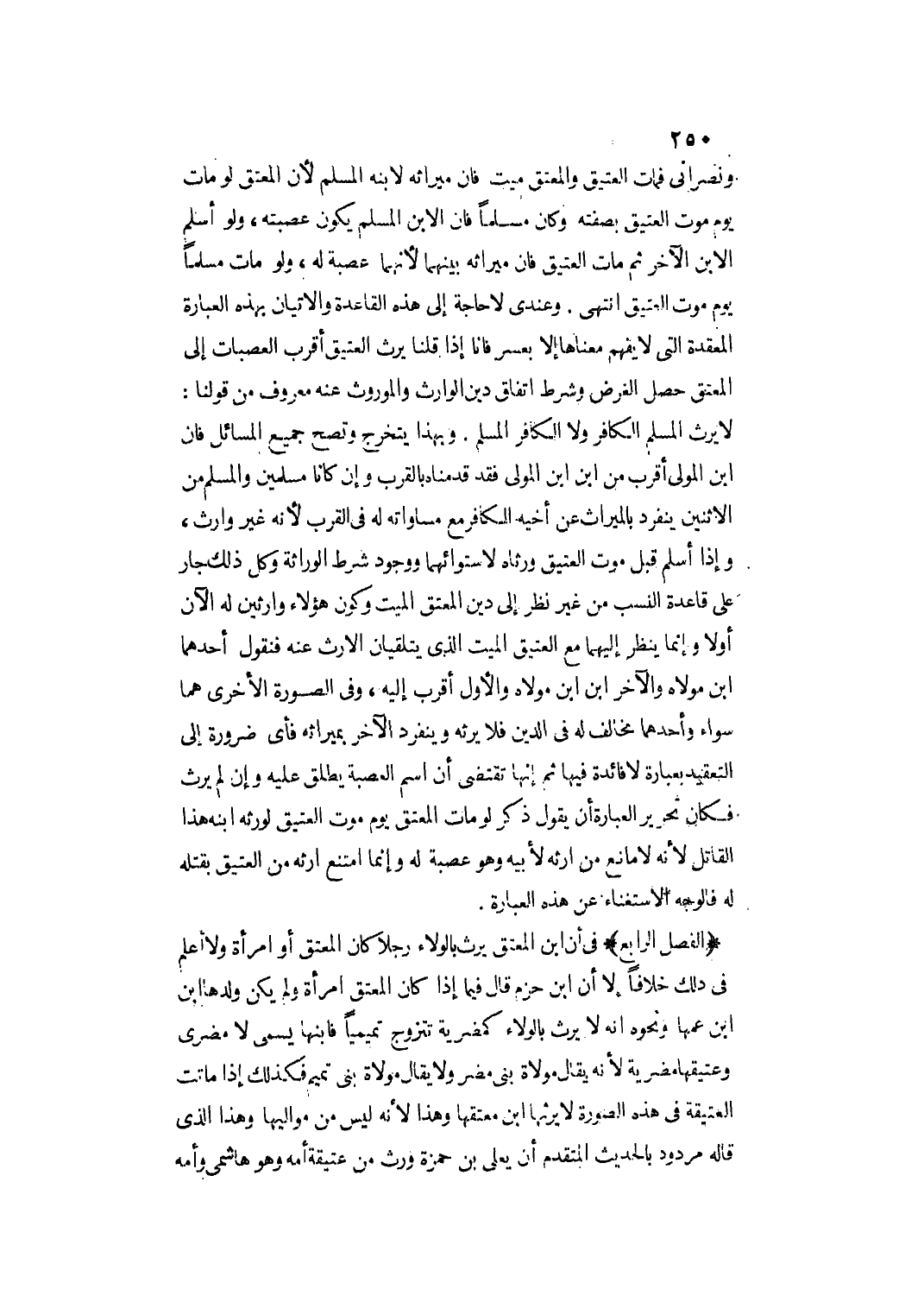 الْفَصْلُ الرَّابِعُ فِي أَنَّ ابْنَ الْمُعْتِقِ يَرِثُ بِالْوَلَاءِ رَجُلًا كَانَ الْمُعْتِقُ أَوْ امْرَأَةً وَلَا أَعْلَمُ فِي ذَلِكَ خِلَافًا إلَّا أَنَّ ابْنَ حَزْمٍ قَالَ فِيمَا إذَا كَانَ الْمُعْتِقُ امْرَأَةً وَلَمْ يَكُنْ وَلَدُهَا ابْنَ ابْنِ عَمِّهَا وَنَحْوَهُ: إنَّهُ لَا يَرِثُ بِالْوَلَاءِ كَمُضَرِيَّةٍ تَتَزَوَّجُ تَمِيمِيًّا فَابْنُهَا يُسَمَّى لَا مُضَرِيَّ وَعَتِيقُهَا مُضَرِيَّةٌ؛ لِأَنَّهُ يُقَالُ مَوْلَاةُ بَنِي مُضَرَ وَلَا يُقَالُ مَوْلَاةُ بَنِي تَمِيمٍ فَكَذَلِكَ إذَا مَاتَتْ الْعَتِيقَةُ فِي هَذِهِ الصُّورَةِ لَا يَرِثُهَا ابْنُ مُعْتِقِهَا وَهَذَا؛ لِأَنَّهُ لَيْسَ مِنْ مَوَالِيهَا وَهَذَا الَّذِي قَالَهُ مَرْدُودٌ بِالْحَدِيثِ الْمُتَقَدِّمِ أَنَّ يَعْلَى بْنَ حَمْزَةَ وَرِثَ مِنْ عَتِيقَةِ أُمِّهِ وَهُوَ هَاشِمِيٌّ وَأُمُّهُ
