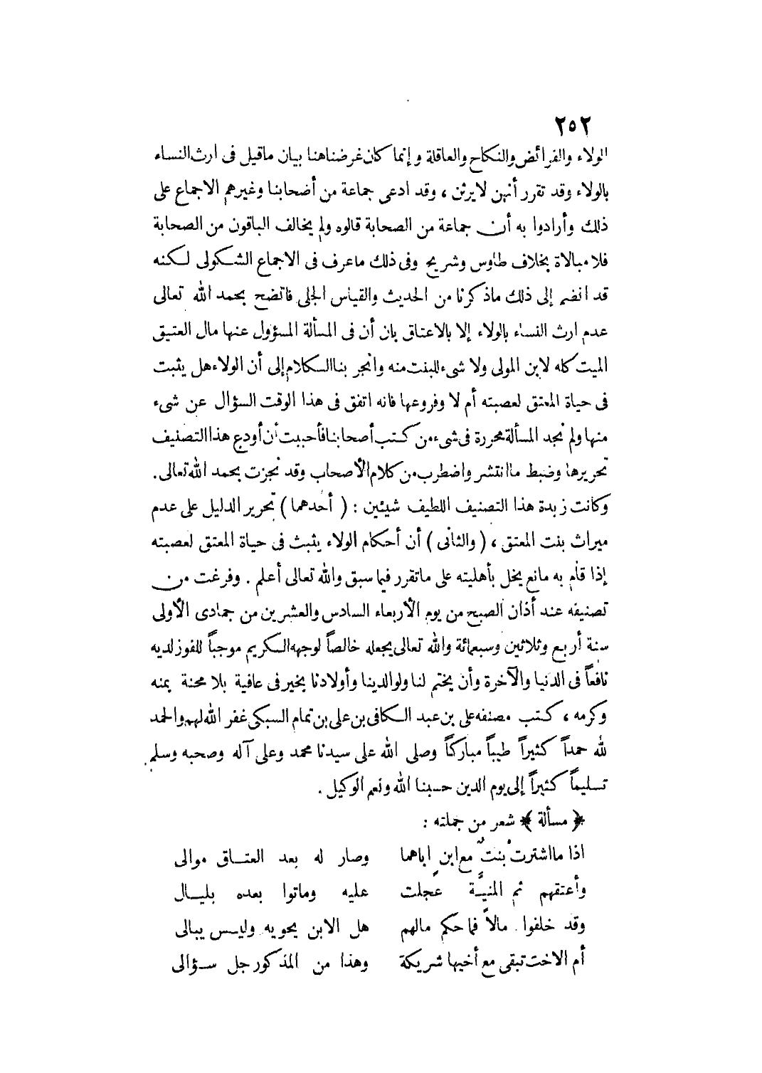 الْوَلَاءِ وَالْفَرَائِضِ وَالنِّكَاحِ وَالْعَاقِلَةِ وَإِنَّمَا كَانَ غَرَضُنَا هُنَا بَيَانُ مَا قِيلَ فِي إرْثِ النِّسَاءِ بِالْوَلَاءِ وَقَدْ تَقَرَّرَ أَنَّهُنَّ لَا يَرِثْنَ، وَقَدْ ادَّعَى جَمَاعَةٌ مِنْ أَصْحَابِنَا وَغَيْرِهِمْ الْإِجْمَاعَ عَلَى ذَلِكَ وَأَرَادُوا بِهِ أَنَّ جَمَاعَةً مِنْ الصَّحَابَةِ قَالُوهُ وَلَمْ يُخَالِفْ الْبَاقُونَ مِنْ الصَّحَابَةِ فَلَا مُبَالَاةَ بِخِلَافِ طَاوُسٍ وَشُرَيْحٍ وَفِي ذَلِكَ مَا عُرِفَ فِي الْإِجْمَاعِ الشَّكُولِيِّ لَكِنَّهُ قَدْ انْضَمَّ إلَى ذَلِكَ مَا ذَكَرْنَا مِنْ الْحَدِيثِ وَالْقِيَاسِ الْجَلِيِّ فَاتَّضَحَ بِحَمْدِ اللَّهِ تَعَالَى عَدَمُ إرْثِ النِّسَاءِ بِالْوَلَاءِ إلَّا بِالْإِعْتَاقِ بَانَ أَنَّ فِي الْمَسْأَلَةِ الْمَسْئُولِ عَنْهَا مَالُ الْعَتِيقِ الْمَيِّتِ كُلُّهُ لِابْنِ الْمَوْلَى وَلَا شَيْءَ لِلْبِنْتِ مِنْهُ، وَانْجَرَّ بِنَا الْكَلَامُ إلَى أَنَّ الْوَلَاءَ هَلْ يَثْبُتُ فِي حَيَاةِ الْمُعْتِقِ لِعَصَبَتِهِ أَمْ لَا وَفُرُوعِهَا فَإِنَّهُ اتَّفَقَ فِي هَذَا الْوَقْتِ السُّؤَالُ عَنْ شَيْءٍ مِنْهَا وَلَمْ نَجِدْ الْمَسْأَلَةَ مُحَرَّرَةً فِي شَيْءٍ مِنْ كُتُبِ أَصْحَابِنَا فَأَحْبَبْت أَنْ أُودِعَ هَذَا التَّصْنِيفَ تَحْرِيرَهَا وَضَبْطَ مَا انْتَشَرَ وَاضْطَرَبَ مِنْ كَلَامِ الْأَصْحَابِ وَقَدْ نَجَزْت بِحَمْدِ اللَّهِ تَعَالَى. وَكَانَتْ زُبْدَةُ هَذَا التَّصْنِيفِ اللَّطِيفِ شَيْئَيْنِ: