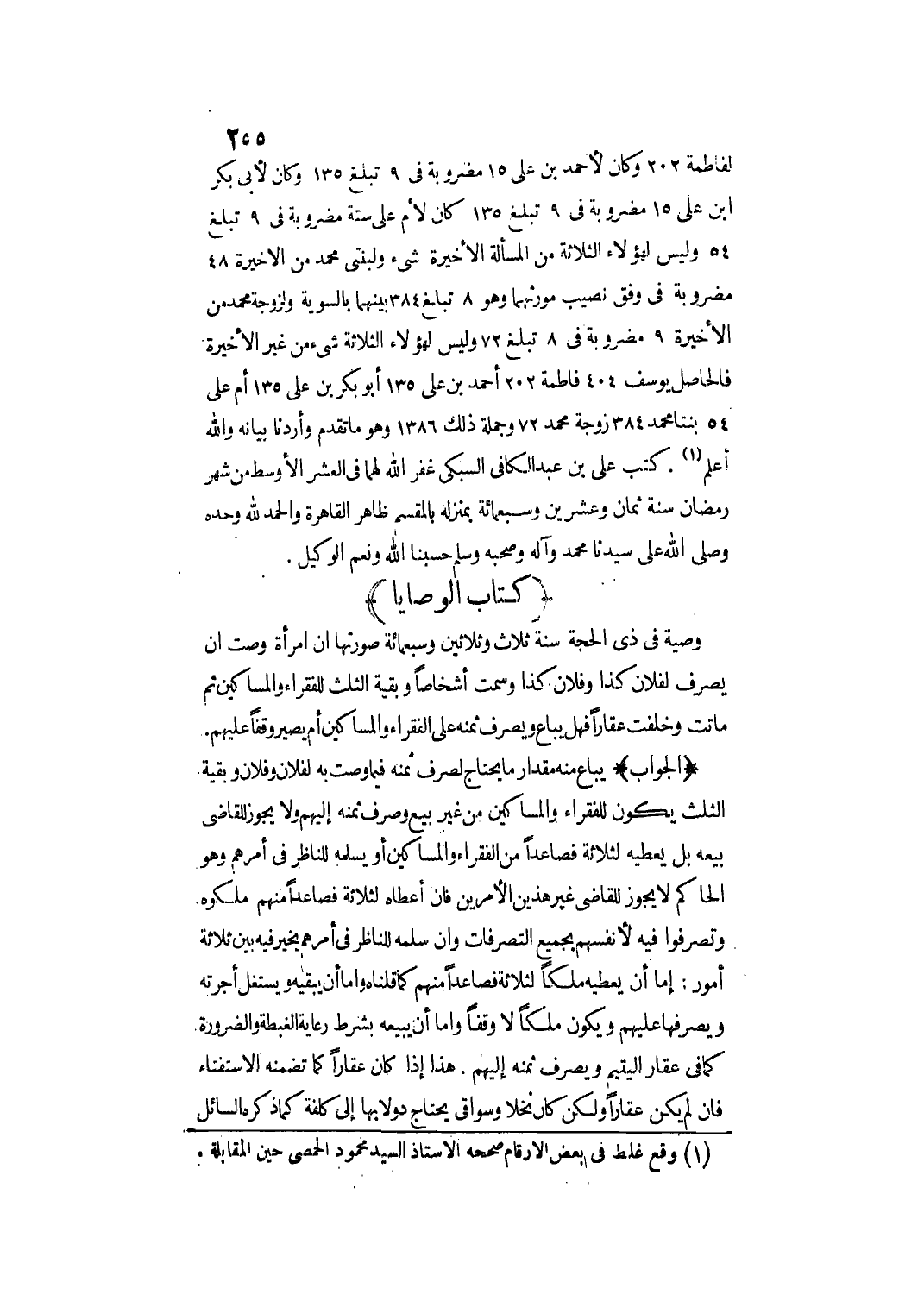 لَفَاطِمَةَ 202، وَكَانَ لِأَحْمَدَ بْنِ عَلِيٍّ 15 مَضْرُوبَةٌ فِي 9 تَبْلُغُ 135، وَكَانَ لِأَبِي بَكْرِ بْنِ عَلِيٍّ 15 مَضْرُوبَةٌ فِي 9 تَبْلُغُ 135 كَانَ لِأُمِّ عَلِيٍّ سِتَّةٌ مَضْرُوبَةٌ فِي 9 تَبْلُغُ 54 وَلَيْسَ لِهَؤُلَاءِ الثَّلَاثَةِ مِنْ الْمَسْأَلَةِ الْأَخِيرَةِ شَيْءٌ وَلِبِنْتَيْ مُحَمَّدٍ مِنْ الْأَخِيرَةِ 48 مَضْرُوبَةٌ فِي وَفْقِ نَصِيبِ مُوَرِّثِهِمَا وَهُوَ 8 تَبْلُغُ 384 بَيْنَهُمَا بِالسَّوِيَّةِ وَلِزَوْجَةِ مُحَمَّدٍ مِنْ الْأَخِيرَةِ 9 مَضْرُوبَةٌ فِي 8 تَبْلُغُ 72 وَلَيْسَ لِهَؤُلَاءِ الثَّلَاثَةِ شَيْءٌ مِنْ غَيْرِ الْأَخِيرَةِ فَالْحَاصِلُ: يُوسُفُ 404 فَاطِمَةُ 202 أَحْمَدُ بْنُ عَلِيٍّ 135 أَبُو بَكْرِ بْنُ عَلِيٍّ 135 أُمُّ عَلِيٍّ 54 بِنْتَا مُحَمَّدٍ 384 زَوْجَةُ مُحَمَّدٍ 72 وَجُمْلَةُ ذَلِكَ 1386 وَهُوَ مَا تَقَدَّمَ وَأَرَدْنَا بَيَانَهُ. وَاَللَّهُ أَعْلَمُ.