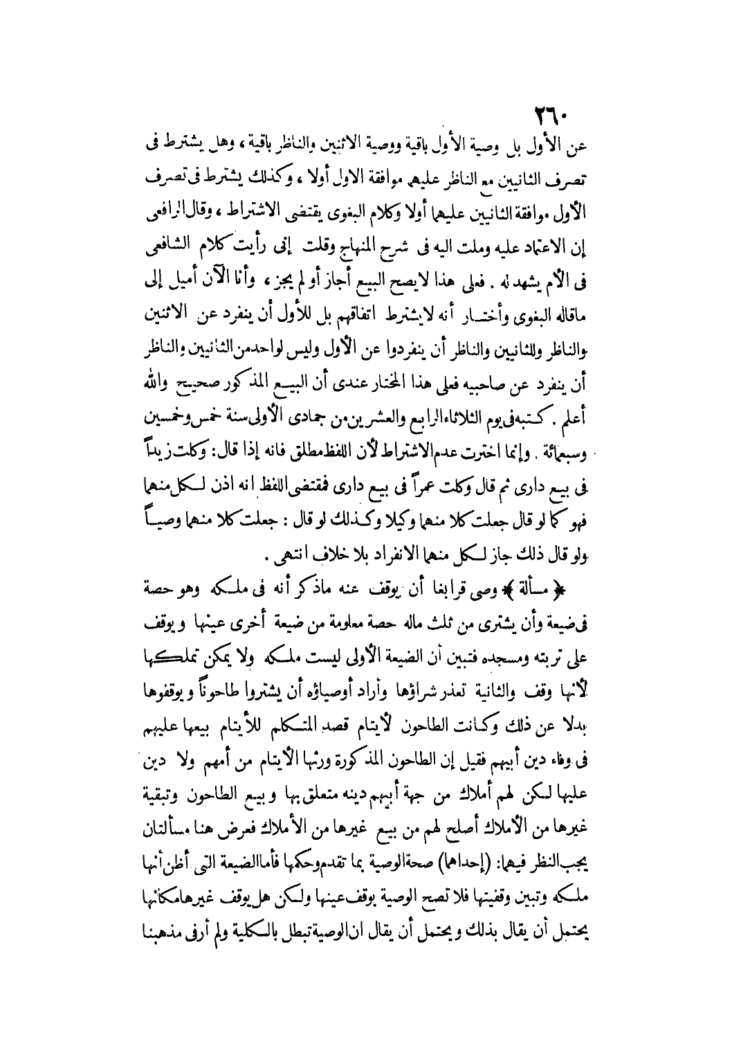 كَتَبَهُ فِي يَوْمِ الثُّلَاثَاءِ الرَّابِعِ وَالْعِشْرِينَ مِنْ جُمَادَى الْأُولَى سَنَةَ خَمْسٍ وَخَمْسِينَ وَسَبْعِمِائَةٍ وَإِنَّمَا اخْتَرْت عَدَمَ الِاشْتِرَاطِ؛ لِأَنَّ اللَّفْظَ مُطْلَقٌ فَإِنَّهُ إذَا قَالَ: وَكَّلْت زَيْدًا فِي بَيْعِ دَارِي، ثُمَّ قَالَ: وَكَّلْت عَمْرًا فِي بَيْعِ دَارِي فَمُقْتَضَى اللَّفْظِ أَنَّهُ أَذِنَ لِكُلٍّ مِنْهُمَا، فَهُوَ كَمَا لَوْ قَالَ: جَعَلْت كُلًّا مِنْهُمَا وَكِيلًا وَكَذَلِكَ لَوْ قَالَ: جَعَلْت كُلًّا مِنْهُمَا وَصِيًّا، وَلَوْ قَالَ ذَلِكَ جَازَ لِكُلٍّ مِنْهُمَا الِانْفِرَادُ بِلَا خِلَافٍ. انْتَهَى.