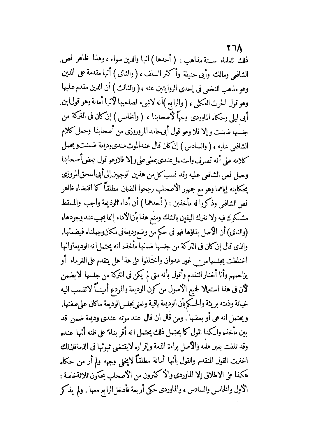 وَيَحْتَمِلُ أَنَّهُ هِيَ أَوْ بَعْضُهَا. وَمَنْ قَالَ إنْ قَالَ عِنْدَ مَوْتِهِ: عِنْدِي وَدِيعَةٌ ضَمِنَ قَدْ بَيَّنَ مَأْخَذَهُ وَلَكِنَّا نَقُولُ كَمَا يَحْتَمِلُ ذَلِكَ يَحْتَمِلُ أَنَّهُ أَقَرَّ بِنَاءً عَلَى ظَنِّهِ، أَنَّهَا عِنْدَهُ وَقَدْ تَلِفَتْ بِغَيْرِ عِلْمِهِ وَالْأَصْلُ بَرَاءَةُ الذِّمَّةِ وَإِقْرَارُهُ لَا يَقْتَضِي ثُبُوتَهَا فِي الذِّمَّةِ فَلِذَلِكَ اخْتَرْت الْقَوْلَ الْمُتَقَدِّمَ وَالْقَوْلُ بِأَنَّهَا أَمَانَةٌ مُطْلَقًا لَا يَخْفَى وَجْهُهُ وَلَمْ أَرَ مَنْ حَكَاهُ هَكَذَا عَلَى الْإِطْلَاقِ إلَّا الْمَاوَرْدِيُّ وَالْأَكْثَرُونَ مِنْ الْأَصْحَابِ يَحْكُونَ ثَلَاثَةً خَاصَّةً: الْأَوَّلَ وَالْخَامِسَ وَالسَّادِسَ وَالْمَاوَرْدِيُّ حَكَى أَرْبَعَةً فَأَدْخَلَ الرَّابِعَ مَعَهَا.
