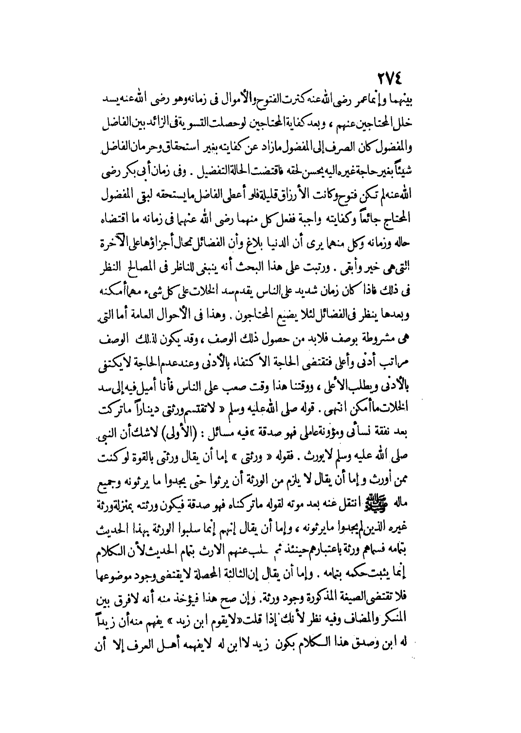 وَفِي زَمَانِ أَبِي بَكْرٍ - رَضِيَ اللَّهُ عَنْهُ - لَمْ تَكُنْ فُتُوحٌ وَكَانَتْ الْأَرْزَاقُ قَلِيلَةً فَلَوْ أَعْطَى الْفَاضِلَ مَا يَسْتَحِقُّهُ لَبَقِيَ الْمَفْضُولُ الْمُحْتَاجُ جَائِعًا وَكِفَايَتُهُ وَاجِبَةٌ فَفَعَلَ كُلٌّ مِنْهُمَا فِي زَمَانِهِ مَا اقْتَضَاهُ حَالُهُ وَزَمَانُهُ وَكُلٌّ مِنْهُمَا يَرَى أَنَّ الدُّنْيَا بَلَاغٌ وَأَنَّ الْفَضَائِلَ تُحَالُ أَجْزَاؤُهَا عَلَى الْآخِرَةِ الَّتِي هِيَ خَيْرٌ وَأَبْقَى.