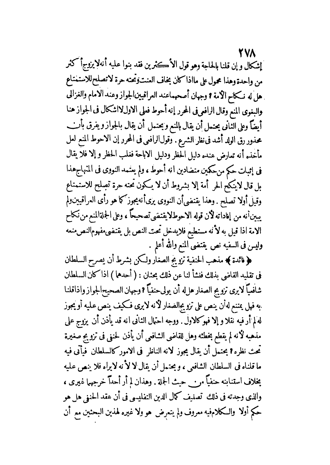 إشْكَالَ، وَإِنْ قُلْنَا بِالْحَاجَةِ وَهُوَ قَوْلُ الْأَكْثَرِينَ فَقَدْ بَنَوْا عَلَيْهِ أَنَّهُ لَا يُزَوَّجُ أَكْثَرَ مِنْ وَاحِدَةٍ وَهَذَا مَحْمُولٌ عَلَى مَا إذَا كَانَ يَخَافُ الْعَنَتَ وَتَحْتَهُ حُرَّةٌ لَا تَصْلُحُ لِلِاسْتِمْتَاعِ هَلْ لَهُ نِكَاحُ الْأَمَةِ؟ وَجْهَانِ أَصَحُّهُمَا عِنْدَ الْعِرَاقِيِّينَ الْجَوَازُ وَعِنْدَ الْإِمَامِ وَالْغَزَالِيِّ وَالْبَغَوِيِّ الْمَنْعُ وَقَالَ الرَّافِعِيُّ فِي الْمُحَرَّرِ: إنَّهُ أَحْوَطُ فَعَلَى الْأَوَّلِ لَا إشْكَالَ فِي الْجَوَازِ هُنَا أَيْضًا وَعَلَى الثَّانِي يَحْتَمِلُ أَنْ يُقَالَ بِالْمَنْعِ وَيَحْتَمِلُ أَنْ يُقَالَ بِالْجَوَازِ وَيُفَرَّقُ بِأَنَّ مَحْذُورَ رَقِّ الْوَلَدِ أَشَدُّ فِي نَظَرَ الشَّرْعِ.
