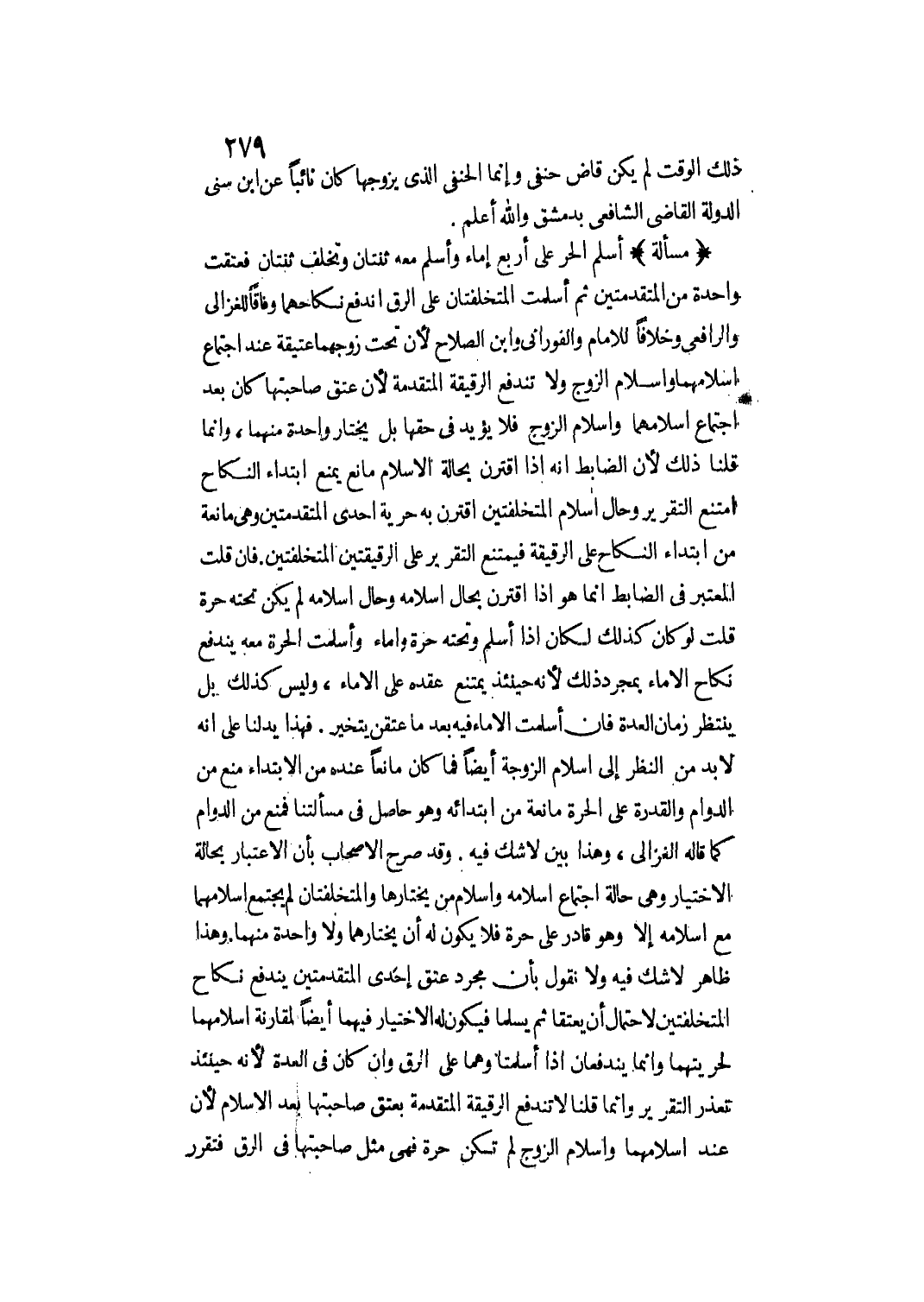 (مَسْأَلَةٌ) أَسْلَمَ الْحُرُّ عَلَى أَرْبَعِ إمَاءٍ وَأَسْلَمَ مَعَهُ ثِنْتَانِ وَتَخَلَّفَ ثِنْتَانِ فَعَتَقَتْ وَاحِدَةٌ مِنْ الْمُتَقَدِّمَتَيْنِ ثُمَّ أَسْلَمَتْ الْمُتَخَلِّفَتَانِ عَلَى الرِّقِّ انْدَفَعَ نِكَاحُهُمَا وِفَاقًا لِلْغَزَالِيِّ وَالرَّافِعِيِّ وَخِلَافًا لِلْإِمَامِ وَالْفُورَانِيِّ وَابْنِ الصَّلَاحِ؛ لِأَنَّ تَحْتَ زَوْجِهِمَا عَتِيقَةً عِنْدَ اجْتِمَاعِ إسْلَامِهِمَا وَإِسْلَامِ الزَّوْجِ وَلَا تَنْدَفِعُ الرَّقِيقَةُ الْمُتَقَدِّمَةُ؛ لِأَنَّ عِتْقَ صَاحِبَتِهَا كَانَ بَعْدَ اجْتِمَاعِ إسْلَامِهِمَا وَإِسْلَامِ الزَّوْجِ فَلَا يُؤَيَّدُ فِي حَقِّهَا بَلْ يَخْتَارُ وَاحِدَةً مِنْهُمَا، وَإِنَّمَا قُلْنَا ذَلِكَ؛ لِأَنَّ الضَّابِطَ أَنَّهُ إذَا اقْتَرَنَ بِحَالَةِ الْإِسْلَامِ مَانِعٌ يَمْنَعُ ابْتِدَاءَ النِّكَاحِ امْتَنَعَ التَّقْرِيرُ وَحَالَ إسْلَامِ الْمُتَخَلِّفَتَيْنِ اقْتَرَنَ بِهِ حُرِّيَّةُ إحْدَى الْمُتَقَدِّمَتَيْنِ وَهِيَ مَانِعَةٌ مِنْ ابْتِدَاءِ النِّكَاحِ عَلَى الرَّقِيقَةِ فَيَمْتَنِعُ التَّقْرِيرُ عَلَى الرَّقِيقَتَيْنِ الْمُتَخَلِّفَتَيْنِ.