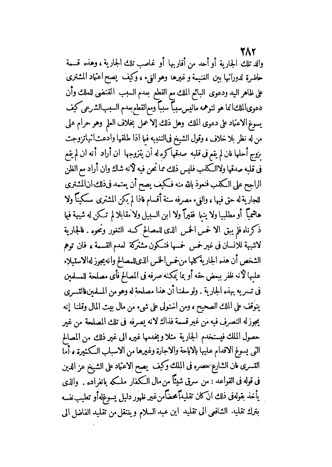 فَالْجَارِيَةُ لَا شُبْهَةَ لِلْإِنْسَانِ فِي غَيْرِ خُمُسِ خُمُسِهَا فَتَكُونُ مُشْتَرَكَةً لِعَدَمِ الْقِسْمَةِ، فَإِنْ تَوَهَّمَ الشَّخْصُ أَنَّ هَذِهِ الْجَارِيَةَ كُلَّهَا مِنْ خُمُسِ الْخُمُسِ الَّذِي لِلْمَصَالِحِ وَأَنَّهُ يَجُوزُ لَهُ الِاسْتِيلَاءُ عَلَيْهَا؛ لِأَنَّهُ ظَفِرَ بِبَعْضِ حَقِّهِ أَوْ بِمَا يُمَكِّنُهُ صَرْفُهُ فِي الْمَصَالِحِ فَأَيُّ مَصْلَحَةٍ لِلْمُسْلِمِينَ فِي تَسَرِّيه بِهَذِهِ الْجَارِيَةِ.