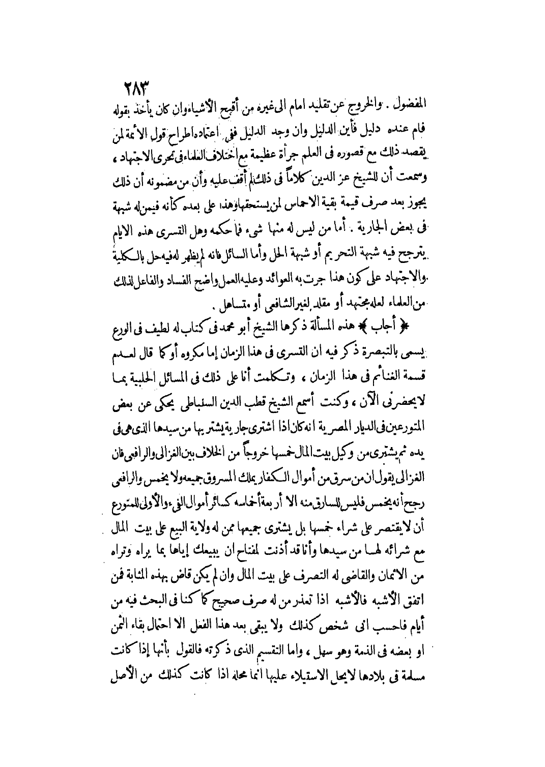 (أَجَابَ) هَذِهِ الْمَسْأَلَةُ ذَكَرَهَا الشَّيْخُ أَبُو مُحَمَّدٍ فِي كِتَابٍ لَهُ لَطِيفٍ فِي الْوَرَعِ يُسَمَّى بِالتَّبْصِرَةِ ذَكَرَ فِيهِ أَنَّ التَّسَرِّيَ فِي هَذَا الزَّمَانِ إمَّا مَكْرُوهٌ أَوْ كَمَا قَالَ لِعَدَمِ قِسْمَةِ الْغَنَائِمِ فِي هَذَا الزَّمَانِ، وَتَكَلَّمْت أَنَا عَلَى ذَلِكَ فِي الْمَسَائِلِ الْحَلَبِيَّةِ بِمَا لَا يَحْضُرُنِي الْآنَ، وَكُنْت أَسْمَعُ الشَّيْخَ قُطْبَ الدِّينِ السَّنْبَاطِيَّ يَحْكِي عَنْ بَعْضِ الْمُتَوَرِّعِينَ فِي الدِّيَارِ الْمِصْرِيَّةِ أَنَّهُ كَانَ إذَا اشْتَرَى جَارِيَةً يَشْتَرِيهَا مِنْ سَيِّدِهَا الَّذِي هِيَ فِي يَدِهِ ثُمَّ يَشْتَرِي مِنْ وَكِيلِ بَيْتِ الْمَالِ خُمُسَهَا خُرُوجًا مِنْ الْخِلَافِ بَيْنَ الْغَزَالِيِّ وَالرَّافِعِيِّ فَإِنَّ الْغَزَالِيَّ يَقُولُ: إنَّ مِنْ سَرَقَ مِنْ أَمْوَالِ الْكُفَّارِ يَمْلِكُ الْمَسْرُوقَ جَمِيعَهُ وَلَا يُخَمِّسُ وَالرَّافِعِيُّ رَجَّحَ أَنَّهُ يُخَمِّسُ فَلَيْسَ لِلسَّارِقِ مِنْهُ إلَّا أَرْبَعَةُ أَخْمَاسِهِ كَسَائِرِ أَمْوَالِ الْفَيْءِ وَالْأُولَى لِلْمُتَوَرِّعِ أَنْ لَا يَقْتَصِرَ عَلَى شِرَاءِ خُمُسِهَا بَلْ يَشْتَرِي جَمِيعَهَا مِمَّنْ لَهُ وِلَايَةُ الْبَيْعِ عَلَى بَيْتِ الْمَالِ مَعَ شِرَائِهِ لَهَا مِنْ سَيِّدِهَا وَأَنَا قَدْ أَذِنْت لِمِفْتَاحٍ أَنْ يَبِيعَك إيَّاهَا بِمَا يَرَاهُ وَتَرَاهُ مِنْ الْأَثْمَانِ وَالْقَاضِي لَهُ التَّصَرُّفُ عَلَى بَيْتِ الْمَالِ، وَإِنْ لَمْ يَكُنْ قَاضٍ بِهَذِهِ الْمَثَابَةِ فَمَنْ اتَّفَقَ الْأَشْبَهُ فَالْأَشْبَهُ إذَا تَعَذَّرَ مَنْ لَهُ صَرْفٌ صَحِيحٌ كَمَا كُنَّا فِي الْبَحْثِ فِيهِ مِنْ أَيَّامٍ فَأَحْسَبُ أَنِّي شَخْصٌ كَذَلِكَ وَلَا يَبْقَى بَعْدَ هَذَا الْفِعْلِ إلَّا احْتِمَالُ بَقَاءِ الثَّمَنِ أَوْ بَعْضُهُ فِي الذِّمَّةِ وَهُوَ سَهْلٌ.