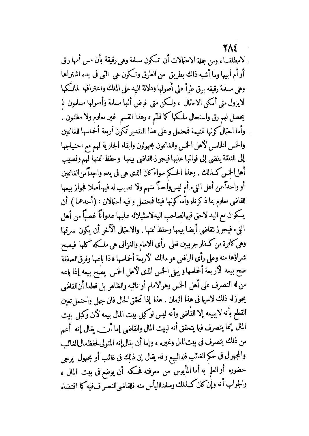 (أَحَدُهُمَا) أَنْ يَكُونَ مَعَ الْيَدِ لَا حَقَّ فِيهَا لِصَاحِبِ الْيَدِ لِاسْتِيلَائِهِ عَلَيْهَا عُدْوَانًا غَصْبًا مِنْ أَهْلِ الْفَيْءِ فَيَجُوزُ لِلْقَاضِي أَيْضًا بَيْعُهَا وَحِفْظُ ثَمَنِهَا، وَالِاحْتِمَالُ الْآخَرُ أَنْ يَكُونَ سَرَقَهَا وَهِيَ كَافِرَةٌ مِنْ كُفَّارٍ حَرْبِيِّينَ، فَعَلَى رَأْيِ الْإِمَامِ وَالْغَزَالِيِّ هِيَ مِلْكُهُ كُلُّهَا فَيَصِحُّ شِرَاؤُهَا مِنْهُ، وَعَلَى رَأْيِ الرَّافِعِيِّ هُوَ مَالِكٌ لِأَرْبَعَةِ أَخْمَاسِهَا فَإِذَا بَاعَهَا وَفَرَّقَ الصَّفْقَةَ صَحَّ بَيْعُهُ لِأَرْبَعَةِ أَخْمَاسِهَا وَيَبْقَى الْخُمُسُ الَّذِي لِأَهْلِ الْخُمُسِ يَصِحُّ بَيْعُهُ إذَا بَاعَهُ مَنْ لَهُ التَّصَرُّفُ عَلَى أَهْلِ الْخُمُسِ وَهُوَ الْإِمَامُ أَوْ نَائِبُهُ وَالظَّاهِرُ بَلْ قَطْعًا أَنَّ الْقَاضِيَ يَجُوزُ لَهُ ذَلِكَ لَا سِيَّمَا فِي هَذَا الزَّمَانِ.