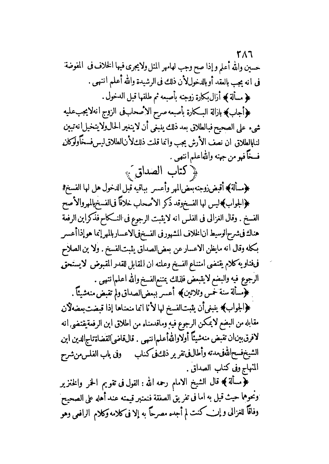 وَلِابْنِ الصَّلَاحِ فِي فَتَاوِيهِ كَلَامٌ يَقْتَضِي امْتِنَاعَ الْفَسْخِ وَعِلَّتُهُ أَنَّ الْمُقَابِلَ لِلْقَدْرِ الْمَقْبُوضِ لَا يَسْتَحِقُّ الرُّجُوعَ فِيهِ وَالْبُضْعُ لَا يَتَبَعَّضُ فَلِذَلِكَ يَمْتَنِعُ الْفَسْخُ. وَاَللَّهُ أَعْلَمُ. انْتَهَى.