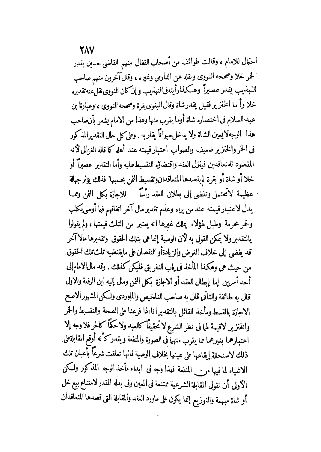 وَعَلَى كُلِّ حَالٍ التَّقْدِيرُ الْمَذْكُورُ فِي الْخَمْرِ وَالْخِنْزِيرِ ضَعِيفٌ وَالصَّوَابُ اعْتِبَارُ قِيمَتِهِ عِنْدَ أَهْلِهِ كَمَا قَالَهُ الْغَزَالِيُّ؛ لِأَنَّهُ الْمَقْصُودُ لِلْمُتَعَاقِدَيْنِ فَيَنْزِلُ الْعَقْدُ وَاقْتِضَاؤُهُ التَّقْسِيطَ عَلَيْهِ وَأَمَّا التَّقْدِيرُ عَصِيرًا أَوْ خَلًّا أَوْ شَاةً أَوْ بَقَرَةً لَمْ يَقْصِدْهَا الْمُتَعَاقِدَانِ وَتَقْسِيطُ الثَّمَنِ بِحَسَبِهَا فَذَلِكَ يُؤْثِرُ جَهَالَةً عَظِيمَةً لَا تُحْتَمَلُ وَتُفْضِي إلَى بُطْلَانِ الْعَقْدِ رَأْسًا لِلْإِجَازَةِ بِكُلِّ الثَّمَنِ وَمِمَّا يَدُلُّ لِاعْتِبَارِ قِيمَتِهِ عِنْدَ مَنْ يَرَاهُ وَعَدَمَ تَقْدِيرِ مَالٍ آخَرَ اتِّفَاقُهُمْ فِيمَا أَوْصَى بِكَلْبٍ وَخَمْرٍ مُحَرَّمَةٍ وَطَبْلٍ لِهَؤُلَاءِ يَمْلِكُ غَيْرَهَا أَنَّهُ يَعْتَبِرُ مِنْ الثُّلُثِ قِيمَتَهَا، وَلَمْ يَقُولُوا بِالتَّقْدِيرِ وَلَا يُمْكِنُ الْقَوْلُ بِهِ؛ لِأَنَّ الْوَصِيَّةَ إنَّمَا هِيَ بِتِلْكَ الْحُقُوقِ وَتَقْدِيرُهَا مَالًا آخَرَ قَدْ يُفْضِي إلَى خِلَافِ الْغَرَضِ وَالزِّيَادَةُ أَوْ النُّقْصَانُ عَلَى مَا يَقْتَضِيه ثُلُثُ تِلْكَ الْحُقُوقِ مِنْ حَيْثُ هِيَ وَهَكَذَا الْمَأْخَذُ فِي بَابِ التَّفْرِيقِ فَلِيَكُنْ كَذَلِكَ.