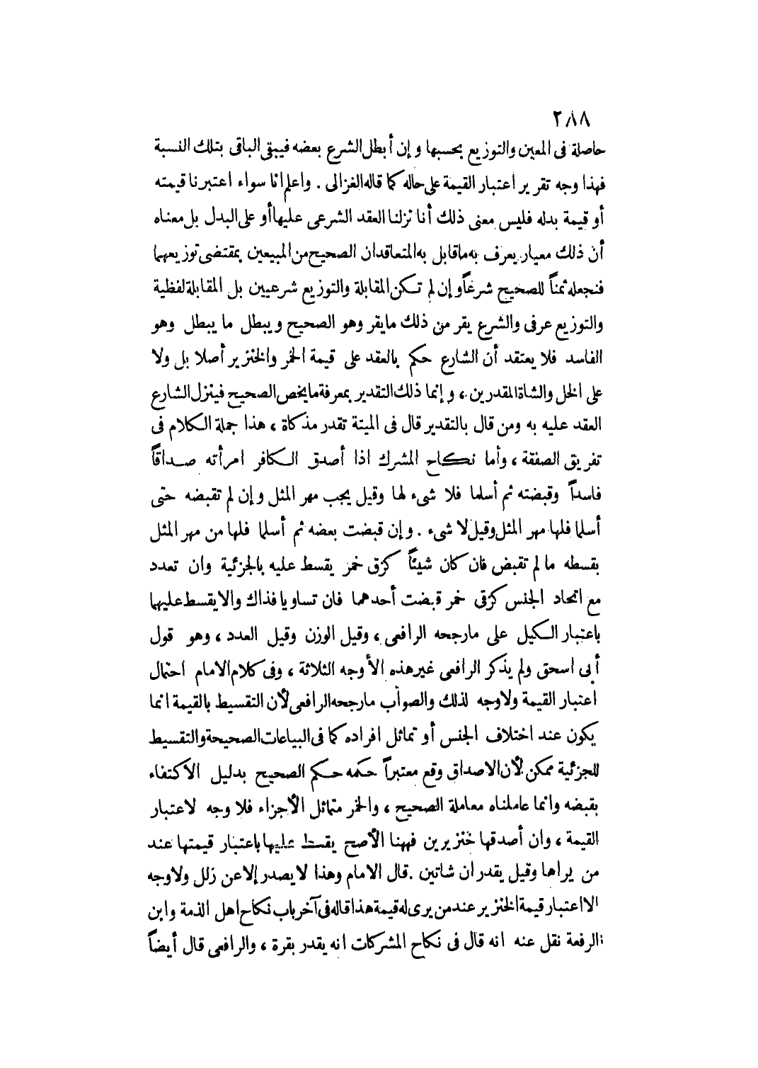 حَاصِلَةٌ فِي الْمُعَيَّنِ وَالتَّوْزِيعُ بِحَسَبِهَا وَإِنْ أَبْطَلَ الشَّرْعُ بَعْضَهُ فَيَبْقَى الْبَاقِي بِتِلْكَ النِّسْبَةِ فَهَذَا وَجْهُ تَقْرِيرِ اعْتِبَارِ الْقِيمَةِ عَلَى حَالِهِ كَمَا قَالَهُ الْغَزَالِيُّ.