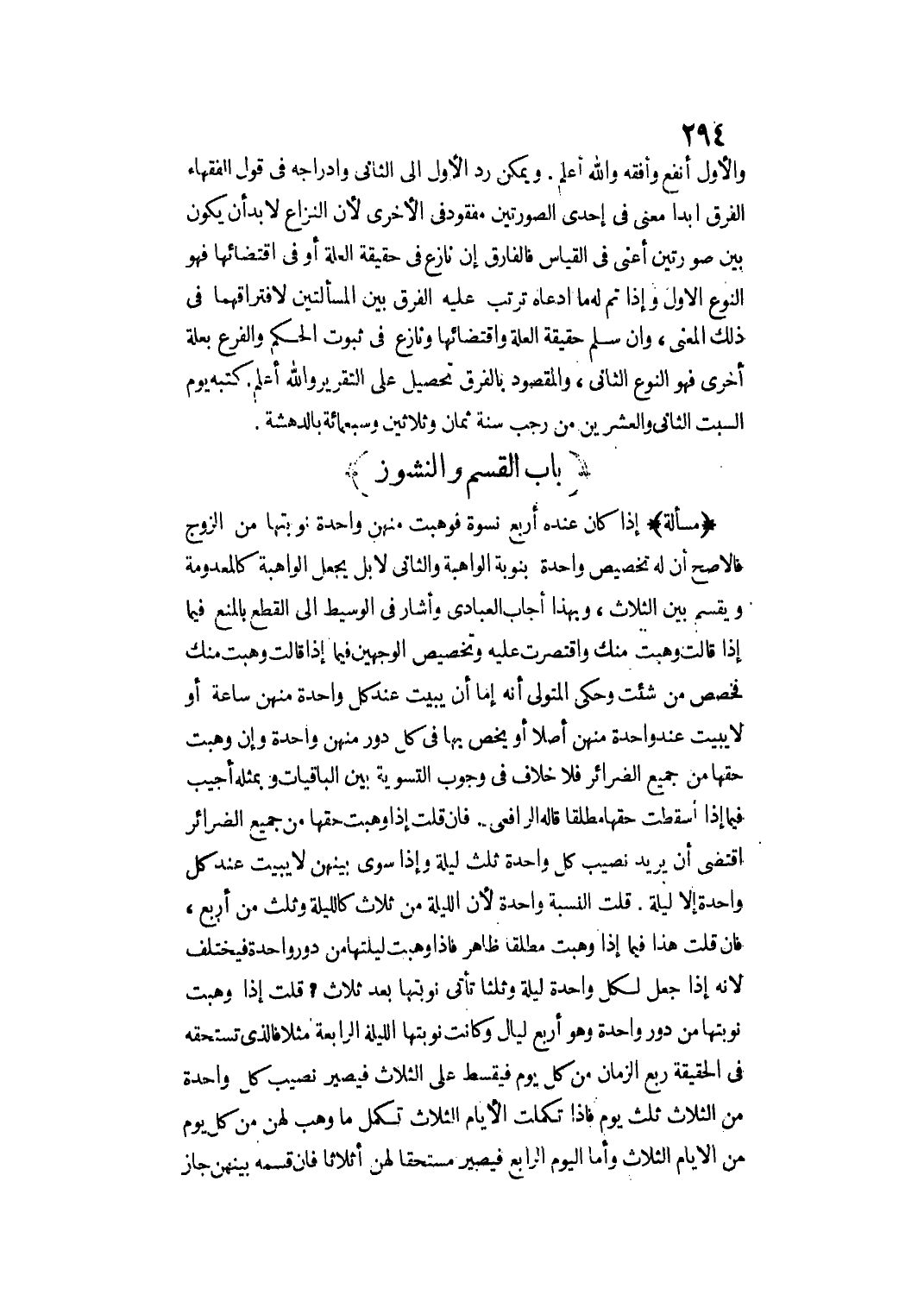ِ (مَسْأَلَةٌ) إذَا كَانَ عِنْدَهُ أَرْبَعُ نِسْوَةٍ فَوَهَبَتْ مِنْهُنَّ وَاحِدَةٌ نَوْبَتَهَا مِنْ الزَّوْجِ فَالْأَصَحُّ أَنَّ لَهُ تَخْصِيصَ وَاحِدَةٍ بِنَوْبَةِ الْوَاهِبَةِ، وَالثَّانِي لَا بَلْ يَجْعَلُ الْوَاهِبَةَ كَالْمَعْدُومَةِ وَيُقَسِّمُ بَيْنَ الثَّلَاثِ، وَبِهَذَا أَجَابَ الْعَبَّادِيُّ وَأَشَارَ فِي الْوَسِيطِ إلَى الْقَطْعِ بِالْمَنْعِ فِيمَا إذَا قَالَتْ: وَهَبْت مِنْك وَاقْتَصَرَتْ عَلَيْهِ وَتَخْصِيصُ الْوَجْهَيْنِ فِيمَا إذَا قَالَتْ: وَهَبَتْ مِنْك فَخَصِّصْ مَنْ شِئْت وَحَكَى الْمُتَوَلِّي أَنَّهُ إمَّا أَنْ يَبِيتَ عِنْدَ كُلِّ وَاحِدَةٍ مِنْهُنَّ سَاعَةٌ أَوْ لَا يَبِيتُ عِنْدَ وَاحِدَةٍ مِنْهُنَّ أَصْلًا أَوْ يَخُصُّ بِهَا فِي كُلِّ دَوْرٍ مِنْهُنَّ وَاحِدَةً وَإِنْ وَهَبَتْ حَقَّهَا مِنْ جَمِيعِ الضَّرَائِرِ فَلَا خِلَافَ فِي وُجُوبِ التَّسْوِيَةِ بَيْنَ الْبَاقِيَاتِ وَبِمِثْلِهِ أُجِيبُ فِيمَا إذَا أَسْقَطَتْ حَقَّهَا مُطْلَقًا قَالَهُ الرَّافِعِيُّ.