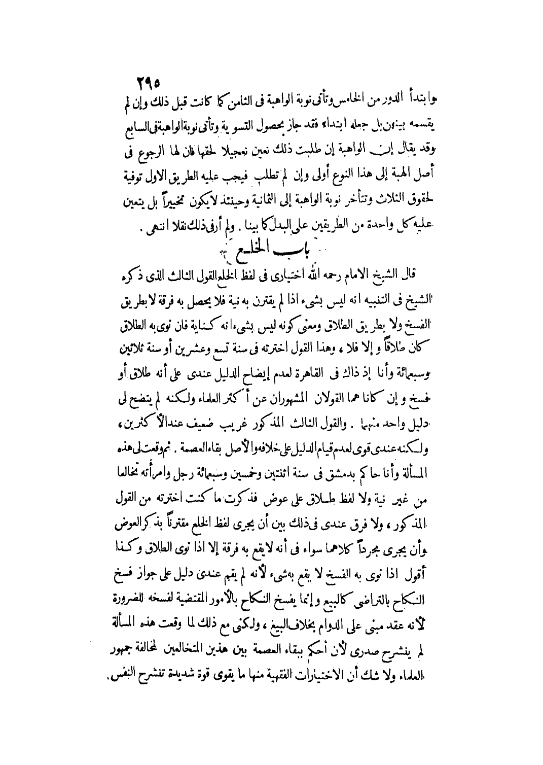 وَإِنْ كَانَا هُمَا الْقَوْلَانِ الْمَشْهُورَانِ عَنْ أَكْثَرِ الْعُلَمَاءِ وَلَكِنَّهُ لَمْ يَتَّضِحْ لِي دَلِيلٌ وَاحِدٌ مِنْهُمَا. وَالْقَوْلُ الثَّالِثُ الْمَذْكُورُ غَرِيبٌ ضَعِيفٌ عِنْدَ الْأَكْثَرِينَ، وَلَكِنَّهُ عِنْدِي قَوِيٌّ لِعَدَمِ قِيَامِ الدَّلِيلِ عَلَى خِلَافِهِ وَالْأَصْلُ بَقَاءُ الْعِصْمَةِ. ثُمَّ وَقَعَتْ لِي هَذِهِ الْمَسْأَلَةُ وَأَنَا حَاكِمٌ بِدِمَشْقَ فِي سَنَةِ اثْنَتَيْنِ وَخَمْسِينَ وَسَبْعِمِائَةِ رَجُلٌ وَامْرَأَتُهُ تَخَالَعَا مِنْ غَيْرِ نِيَّةٍ وَلَا لَفْظِ طَلَاقٍ عَلَى عِوَضٍ فَذَكَرْت مَا كُنْت اخْتَرْته مِنْ الْقَوْلِ الْمَذْكُورِ، وَلَا فَرْقَ عِنْدِي فِي ذَلِكَ بَيْنَ أَنْ يَجْرِيَ لَفْظُ الْخُلْعِ مُقْتَرِنًا بِذِكْرِ الْعِوَضِ وَأَنْ يَجْرِيَ مُجَرَّدًا كِلَاهُمَا سَوَاءٌ فِي أَنَّهُ لَا يَقَعُ بِهِ فُرْقَةٌ إلَّا إذَا نَوَى الطَّلَاقَ، وَكَذَا أَقُولُ: إذَا نَوَى بِهِ الْفَسْخَ لَا يَقَعُ بِهِ شَيْءٌ؛ لِأَنَّهُ لَمْ يَقُمْ عِنْدِي دَلِيلٌ عَلَى جَوَاز فَسْخِ النِّكَاحِ بِالتَّرَاضِي كَالْبَيْعِ وَإِنَّمَا يُفْسَخُ النِّكَاحُ بِالْأُمُورِ الْمُقْتَضِيَةِ لِفَسْخِهِ لِلضَّرُورَةِ؛ لِأَنَّهُ عَقْدٌ مَبْنِيٌّ عَلَى الدَّوَامِ بِخِلَافِ الْبَيْعِ.