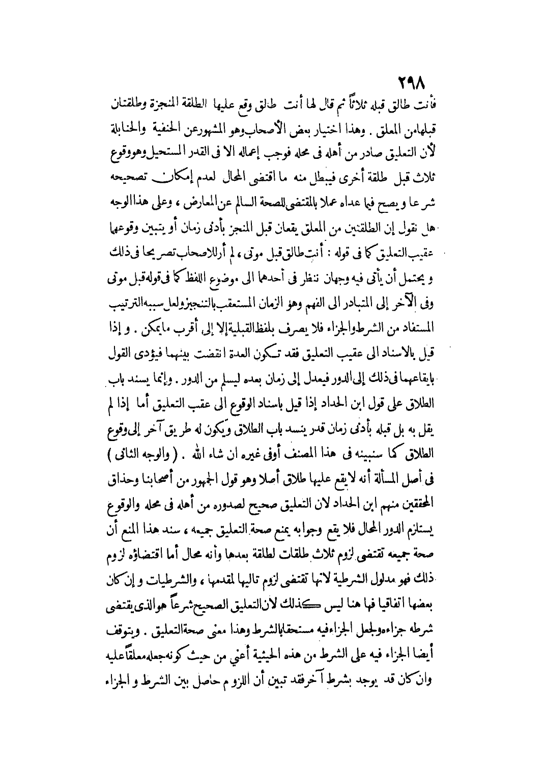 وَإِذَا قِيلَ: بِالْإِسْنَادِ إلَى عَقِيبِ التَّعْلِيقِ فَقَدْ تَكُونُ الْعِدَّةُ انْقَضَتْ بَيْنَهُمَا فَيُؤَدِّي الْقَوْلُ بِإِيقَاعِهِمَا فِي ذَلِكَ إلَى الدَّوْرِ فَيَعْدِلُ إلَى زَمَانٍ بَعْدَهُ لِيَسْلَمَ مِنْ الدَّوْرِ. وَإِنَّمَا يُسْنَدُ بَابُ الطَّلَاقِ عَلَى قَوْلِ ابْنِ الْحَدَّادِ إذَا قِيلَ: بِإِسْنَادِ الْوُقُوعِ إلَى عَقِبِ التَّعْلِيقِ أَمَّا إذَا لَمْ يَقُلْ بِهِ بَلْ قَبْلَهُ بِأَدْنَى زَمَانٍ قَدْ يَنْسَدُّ بَابُ الطَّلَاقِ وَيَكُونُ لَهُ طَرِيقٌ آخَرُ إلَى وُقُوعِ الطَّلَاقِ كَمَا سَنُبَيِّنُهُ فِي هَذَا الْمُصَنَّفِ أَوْ فِي غَيْرِهِ إنْ شَاءَ اللَّهُ.