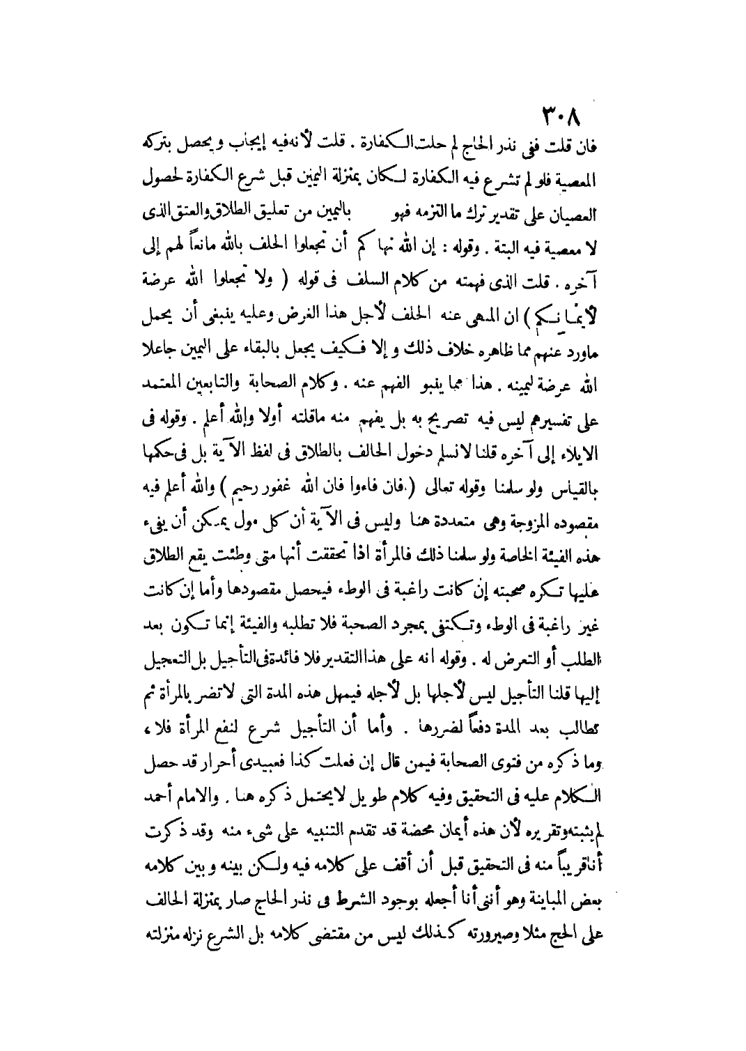 وَقَوْلُهُ إنَّهُ عَلَى هَذَا التَّقْدِيرِ فَلَا فَائِدَةَ فِي التَّأْجِيلِ بَلْ التَّعْجِيلُ إلَيْهَا قُلْنَا: التَّأْجِيلُ لَيْسَ لِأَجْلِهَا بَلْ لِأَجْلِهِ فَيُمْهَلُ هَذِهِ الْمُدَّةَ الَّتِي لَا تَضُرُّ بِالْمَرْأَةِ، ثُمَّ تُطَالِبُ بَعْدَ الْمُدَّةِ دَفْعًا لِضَرَرِهَا. وَأَمَّا أَنَّ التَّأْجِيلَ شُرِعَ لِنَفْعِ الْمَرْأَةِ فَلَا، وَمَا ذَكَرَهُ مِنْ فَتْوَى الصَّحَابَةِ فِيمَنْ قَالَ إنْ فَعَلَتْ كَذَا فَعَبِيدِي أَحْرَارٌ قَدْ حَصَلَ الْكَلَامُ عَلَيْهِ فِي التَّحْقِيقِ وَفِيهِ كَلَامٌ طَوِيلٌ لَا يُحْتَمَلُ ذِكْرُهُ هُنَا. وَالْإِمَام أَحْمَدُ لَمْ يُثْبِتْهُ وَتَقْرِيرُهُ؛ لِأَنَّ هَذِهِ أَيْمَانٌ مَحْضَةً قَدْ تَقَدَّمَ التَّنْبِيهُ عَلَى شَيْءِ مِنْهُ وَقَدْ ذَكَرْت - أَنَا - قَرِيبًا مِنْهُ فِي التَّحْقِيقِ قَبْلَ أَنْ أَقِفَ عَلَى كَلَامِهِ فِيهِ وَلَكِنْ بَيْنَهُ وَبَيْنَ كَلَامِهِ بَعْضُ الْمُبَايَنَةِ وَهُوَ أَنَّنِي - أَنَا - أَجْعَلُهُ بِوُجُودِ الشَّرْطِ فِي نَذْرِ الْحَاجِّ صَارَ بِمَنْزِلَةِ الْحَالِفِ عَلَى الْحَجِّ مَثَلًا وَصَيْرُورَتُهُ كَذَلِكَ لَيْسَ مِنْ مُقْتَضَى كَلَامِهِ بَلْ الشَّرْعُ نَزَّلَهُ مَنْزِلَتَهُ