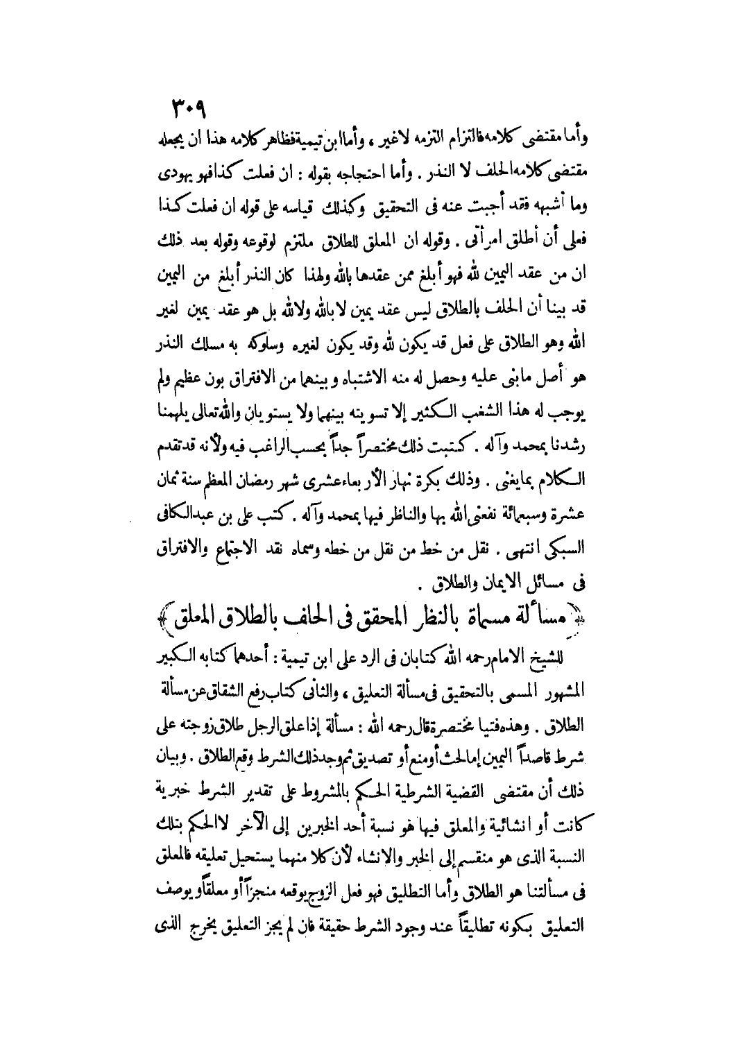(مَسْأَلَةٌ مُسَمَّاةٌ بِالنَّظَرِ الْمُحَقَّقِ فِي الْحَلِفِ بِالطَّلَاقِ الْمُعَلَّقِ) لِلشَّيْخِ الْإِمَامِ - رَحِمَهُ اللَّهُ - كِتَابَانِ فِي الرَّدِّ عَلَى ابْنِ تَيْمِيَّةَ: أَحَدُهُمَا كِتَابُهُ الْكَبِيرُ الْمَشْهُورُ الْمُسَمَّى بِالتَّحْقِيقِ فِي مَسْأَلَةِ التَّعْلِيقِ، وَالثَّانِي كِتَابُ رَفْعِ الشِّقَاقِ عَنْ مَسْأَلَةِ الطَّلَاقِ. وَهَذِهِ فُتْيَا مُخْتَصَرَةٌ قَالَ - رَحِمَهُ اللَّهُ -: مَسْأَلَةٌ: إذَا عَلَّقَ الرَّجُلُ طَلَاقَ زَوْجَتِهِ عَلَى شَرْطٍ قَاصِدًا الْيَمِينَ إمَّا لِحَثٍّ أَوْ مَنْعٍ أَوْ تَصْدِيقٍ، ثُمَّ وُجِدَ ذَلِكَ الشَّرْطُ وَقَعَ الطَّلَاقُ. وَبَيَانُ ذَلِكَ أَنَّ مُقْتَضَى الْقَضِيَّةِ الشَّرْطِيَّةِ الْحُكْمُ بِالْمَشْرُوطِ عَلَى تَقْدِيرِ الشَّرْطِ خَبَرِيَّةً كَانَتْ أَوْ إنْشَائِيَّةً، وَالْمُعَلَّقُ فِيهَا هُوَ نِسْبَةُ أَحَدِ الْخَبَرَيْنِ إلَى الْآخَرِ لَا الْحُكْمُ بِتِلْكَ النِّسْبَةِ الَّذِي هُوَ مُنْقَسِمٌ إلَى الْخَبَرِ وَالْإِنْشَاءِ؛ لِأَنَّ كُلًّا مِنْهُمَا يَسْتَحِيلُ تَعْلِيقُهُ فَالْمُعَلَّقُ فِي مَسْأَلَتِنَا هُوَ الطَّلَاقِ وَأَمَّا التَّطْلِيقُ فَهُوَ فِعْلُ الزَّوْجِ يُوقِعُهُ مُنْجَزًا أَوْ مُعَلَّقًا وَيُوصَفُ التَّعْلِيقُ بِكَوْنِهِ تَطْلِيقًا عِنْدَ وُجُودِ الشَّرْطِ حَقِيقَةً فَإِنْ لَمْ يُجِزْ التَّعْلِيقَ يَخْرُجُ الَّذِي
