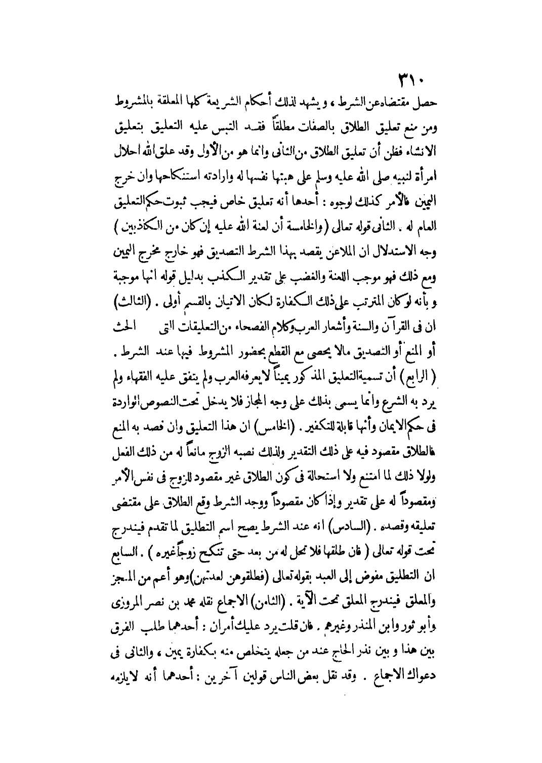 حَصَلَ مُقْتَضَاهُ عَنْ الشَّرْطِ، وَيَشْهَدُ لِذَلِكَ أَحْكَامُ الشَّرِيعَةِ كُلِّهَا الْمُعَلَّقَةِ بِالْمَشْرُوطِ، وَمَنْ مَنَعَ تَعْلِيقَ الطَّلَاقِ بِالصِّفَاتِ مُطْلَقًا فَقَدْ الْتَبَسَ عَلَيْهِ التَّعْلِيقُ بِتَعْلِيقِ الْإِنْشَاءِ فَظَنَّ أَنَّ تَعْلِيقَ الطَّلَاقِ مِنْ الثَّانِي وَإِنَّمَا هُوَ مِنْ الْأَوَّلِ وَقَدْ عَلَّقَ اللَّهُ إحْلَالَ امْرَأَةٍ لِنَبِيِّهِ - صَلَّى اللَّهُ عَلَيْهِ وَسَلَّمَ - عَلَى هِبَتِهَا نَفْسَهَا لَهُ وَإِرَادَتِهِ اسْتِنْكَاحَهَا وَإِنْ خَرَجَ الْيَمِينُ فَالْأَمْرُ كَذَلِكَ لِوُجُوهٍ: أَحَدُهَا أَنَّهُ تَعْلِيقٌ خَاصٌّ فَيَجِبُ ثُبُوتُ حُكْمِ التَّعْلِيقِ الْعَامِّ لَهُ.