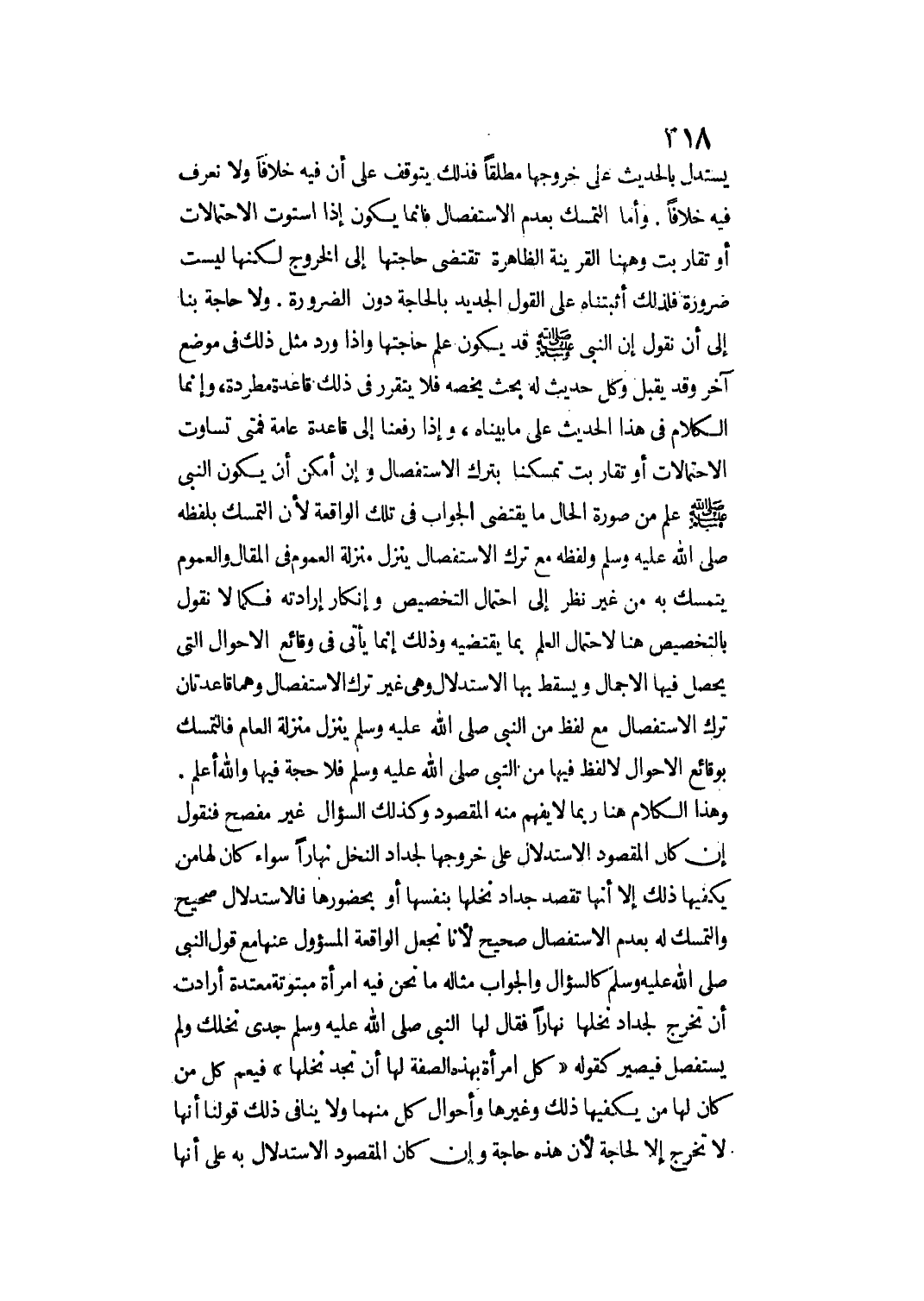 وَلَا حَاجَةَ بِنَا إلَى أَنْ نَقُولَ إنَّ النَّبِيَّ - صَلَّى اللَّهُ عَلَيْهِ وَسَلَّمَ - قَدْ يَكُونُ عَلِمَ حَاجَتَهَا وَإِذَا وَرَدَ مِثْلُ ذَلِكَ فِي مَوْضِعٍ آخَرَ وَقَدْ يُقْبَلُ، وَكُلُّ حَدِيثٍ لَهُ بَحْثٌ يَخُصُّهُ فَلَا يَتَقَرَّرُ فِي ذَلِكَ قَاعِدَةٌ مُطَّرِدَةٌ، وَإِنَّمَا الْكَلَامُ فِي هَذَا الْحَدِيثِ عَلَى مَا بَيَّنَّاهُ، وَإِذَا رَفَعْنَا إلَى قَاعِدَةٍ عَامَّةٍ فَمَتَى تَسَاوَتْ الِاحْتِمَالَاتُ أَوْ تَقَارَبَتْ تَمَسَّكْنَا بِتَرْكِ الِاسْتِفْصَالِ، وَإِنْ أَمْكَنَ أَنْ يَكُونَ النَّبِيُّ - صَلَّى اللَّهُ عَلَيْهِ وَسَلَّمَ - عَلِمَ مِنْ صُورَةِ الْحَالِ مَا يَقْتَضِي الْجَوَابَ فِي تِلْكَ الْوَاقِعَةِ؛ لِأَنَّ التَّمَسُّكَ بِلَفْظِهِ - صَلَّى اللَّهُ عَلَيْهِ وَسَلَّمَ - وَلَفْظُهُ مَعَ تَرْكِ الِاسْتِفْصَالِ يَنْزِلُ مَنْزِلَةَ الْعُمُومِ فِي الْمَقَالِ، وَالْعُمُومُ يُتَمَسَّكُ بِهِ مِنْ غَيْرِ نَظَرٍ إلَى احْتِمَالِ التَّخْصِيصِ وَإِنْكَارِ إرَادَتِهِ فَكَمَا لَا نَقُولُ بِالتَّخْصِيصِ هُنَا لِاحْتِمَالِ الْعِلْمِ بِمَا يَقْتَضِيهِ وَذَلِكَ إنَّمَا يَأْتِي فِي وَقَائِعِ الْأَحْوَالِ الَّتِي يَحْصُلُ فِيهَا الْإِجْمَالُ وَيَسْقُطُ بِهَا الِاسْتِدْلَال وَهِيَ غَيْرُ تَرْكِ الِاسْتِفْصَالِ وَهُمَا قَاعِدَتَانِ: تَرْكُ الِاسْتِفْصَالِ مَعَ لَفْظٍ مِنْ النَّبِيِّ - صَلَّى اللَّهُ عَلَيْهِ وَسَلَّمَ - يَنْزِلُ مَنْزِلَةَ الْعَامِّ فَالتَّمَسُّكُ بِوَقَائِعِ الْأَحْوَالِ لَا لَفْظَ فِيهَا مِنْ النَّبِيِّ - صَلَّى اللَّهُ عَلَيْهِ وَسَلَّمَ - فَلَا حُجَّةَ فِيهَا - وَاَللَّهُ أَعْلَمُ.
