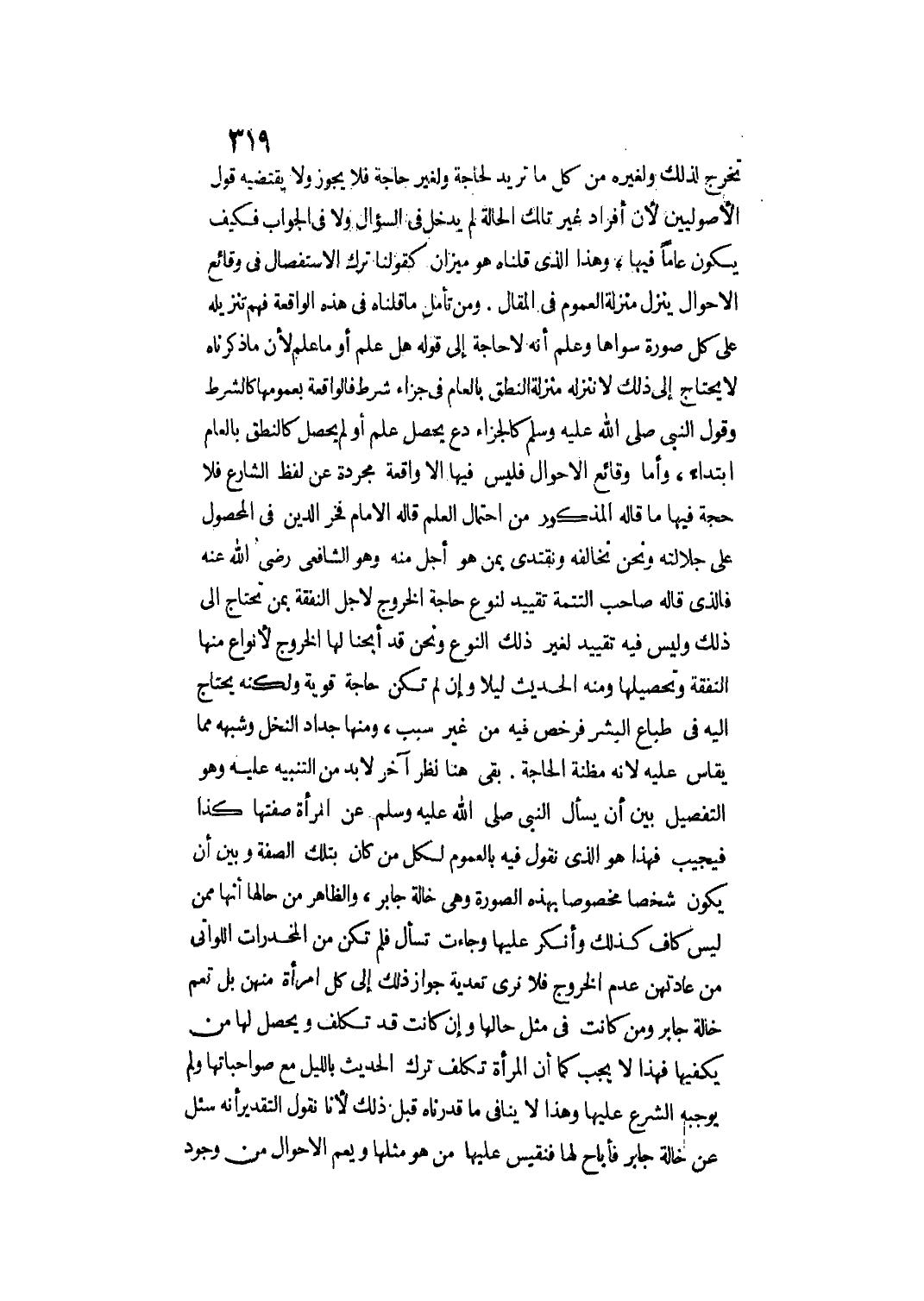 تَخْرُجُ لِذَلِكَ وَلِغَيْرِهِ مِنْ كُلِّ مَا تُرِيدُ لِحَاجَةٍ وَلِغَيْرِ حَاجَةٍ فَلَا يَجُوزُ وَلَا يَقْتَضِيهِ قَوْلُ الْأُصُولِيِّينَ؛ لِأَنَّ إفْرَادِ غَيْرِ تِلْكَ الْحَالَةِ لَمْ يَدْخُلْ فِي السُّؤَالِ وَلَا فِي الْجَوَابِ فَكَيْفَ يَكُونُ عَامًّا فِيهَا.