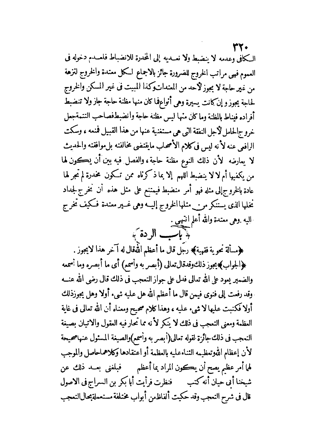 (بَابُ الرِّدَّةِ) (مَسْأَلَةٌ نَحْوِيَّةٌ فِقْهِيَّةٌ) رَجُلٌ قَالَ: مَا أَعْظَمَ اللَّهَ قَالَ لَهُ آخَرُ: هَذَا لَا يَجُوزُ.