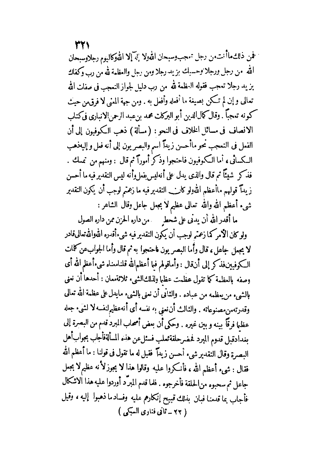 وَلَوْ كَانَ الْأَمْرُ كَمَا زَعَمْتُمْ لَوَجَبَ أَنْ يَكُونَ التَّقْدِيرُ فِيهِ شَيْءٌ أَقْدَرَهُ اللَّهُ، وَاَللَّهُ تَعَالَى قَادِرٌ لَا بِجَعْلِ جَاعِلٍ، قَالَ وَأَمَّا الْبَصْرِيُّونَ فَاحْتَجُّوا بِهِ، ثُمَّ قَالَ وَأَمَّا الْجَوَابُ عَنْ كَلِمَاتِ الْكُوفِيِّينَ فَذَكَرَ إلَى أَنْ قَالَ: وَأَمَّا قَوْلُهُمْ فِيمَا أَعْظَمَ اللَّهَ قُلْنَا مَعْنَاهُ شَيْءٌ أَعْظَمَ اللَّهَ أَيْ وَصَفَهُ بِالْعَظَمَةِ كَمَا تَقُولُ عَظَّمْت عَظِيمًا، وَلِذَلِكَ الشَّيْءِ ثَلَاثَةُ مَعَانٍ: أَحَدُهَا أَنْ نَعْنِيَ بِالشَّيْءِ مَنْ يُعَظِّمُهُ مِنْ عِبَادِهِ. وَالثَّانِي أَنْ نَعْنِيَ بِالشَّيْءِ مَا يَدُلُّ عَلَى عَظَمَةِ اللَّهِ تَعَالَى وَقُدْرَتهِ مِنْ مَصْنُوعَاتِهِ. وَالثَّالِثُ أَنْ نَعْنِيَ بِهِ نَفْسَهُ أَيْ أَنَّهُ عَظِيمٌ لِنَفْسِهِ لَا لِشَيْءٍ جَعَلَهُ عَظِيمًا، فَرْقًا بَيْنَهُ وَبَيْنَ غَيْرِهِ. وَحُكِيَ أَنَّ بَعْضَ أَصْحَابِ الْمُبَرِّدِ قَدِمَ مِنْ الْبَصْرَةِ إلَى بَغْدَادَ قَبْلَ قُدُومِ الْمُبَرِّدِ فَحَضَرَ حَلَقَةَ ثَعْلَبٍ فَسَأَلَ عَنْ هَذِهِ الْمَسْأَلَةِ فَأَجَابَ بِجَوَابِ أَهْلِ الْبَصْرَةِ وَقَالَ التَّقْدِير شَيْءٌ أَحْسَنَ زَيْدًا فَقِيلَ لَهُ: مَا تَقُولُ فِي قَوْلِنَا: مَا أَعْظَمَ اللَّهَ فَقَالَ: شَيْءٌ أَعْظَمَ اللَّهَ، فَأَنْكَرُوا عَلَيْهِ وَقَالُوا: هَذَا لَا يَجُوزُ؛ لِأَنَّهُ عَظِيمٌ لَا بِجَعْلِ جَاعِلٍ، ثُمَّ سَحَبُوهُ مِنْ الْحَلَقَةِ فَأَخْرَجُوهُ. فَلَمَّا قَدِمَ الْمُبَرِّدُ أَوْرَدُوا عَلَيْهِ هَذَا الْإِشْكَالَ فَأَجَابَ بِمَا قَدَّمْنَا فَبَانَ بِذَلِكَ قَبِيحُ إنْكَارِهِمْ عَلَيْهِ وَفَسَادُ مَا ذَهَبُوا إلَيْهِ، وَقِيلَ: