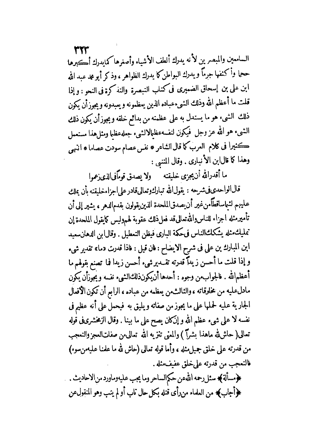 السَّامِعِينَ وَالْمُبْصِرِينَ؛ لِأَنَّهُ يُدْرِكُ أَلْطَفَ الْأَشْيَاءِ وَأَصْغَرَهَا كَمَا يُدْرِكُ أَكْبَرَهَا حَجْمًا وَأَكْثَفَهَا جُرْمًا وَيُدْرِكُ الْبَوَاطِنَ كَمَا يُدْرِكُ الظَّوَاهِرَ، وَذَكَرَ أَبُو مُحَمَّدٍ عَبْدُ اللَّهِ بْنُ عَلِيِّ بْنِ إِسْحَاقَ الضُّمَيْرِيُّ فِي كِتَابِ التَّبْصِرَةِ وَالتَّذْكِرَةِ فِي النَّحْوِ: وَإِذَا قُلْت مَا أَعْظَمَ اللَّهَ وَذَلِكَ الشَّيْءُ، عِبَادُهُ الَّذِينَ يُعَظِّمُونَهُ وَيَعْبُدُونَهُ وَيَجُوزُ أَنْ يَكُونَ ذَلِكَ الشَّيْءُ هُوَ مَا يُسْتَدَلُّ بِهِ عَلَى عَظَمَتِهِ مِنْ بَدَائِعِ خَلْقِهِ وَيَجُوزُ أَنْ يَكُونَ ذَلِكَ الشَّيْءُ هُوَ اللَّهُ عَزَّ وَجَلَّ فَيَكُونُ لِنَفْسِهِ عَظِيمًا لَا لِشَيْءٍ جَعَلَهُ عَظِيمًا وَمِثْلُ هَذَا مُسْتَعْمَلٌ كَثِيرًا فِي كَلَامِ الْعَرَبِ كَمَا قَالَ الشَّاعِرُ
