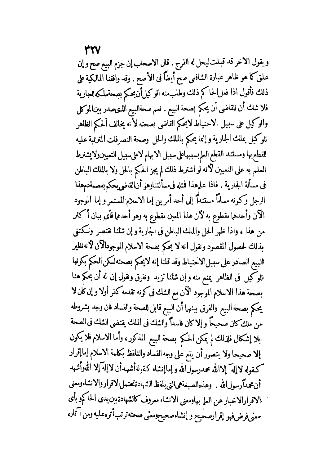 قَالَ الْأَصْحَابُ إنْ جَزَمَ الْبَيْعَ صَحَّ وَإِنْ عَلَّقَ كَمَا هُوَ ظَاهِرُ عِبَارَةِ الشَّافِعِيِّ صَحَّ أَيْضًا فِي الْأَصَحِّ. وَقَدْ وَافَقَنَا الْمَالِكِيَّةُ عَلَى ذَلِكَ؛ فَأَقُولُ إذَا فَعَلَ الْحَاكِمُ ذَلِكَ وَطَلَبَ مِنْهُ الْوَكِيلُ أَنْ يَحْكُمَ بِصِحَّةِ مِلْكِهِ لِلْجَارِيَةِ فَلَا شَكَّ أَنَّ لِلْقَاضِي أَنْ يَحْكُمَ بِصِحَّةِ الْبَيْعِ. نَعَمْ صِحَّةُ الْبَيْعِ الَّذِي صَدَرَ بَيْنَ الْمُوَكِّلِ وَالْوَكِيلِ عَلَى سَبِيلِ الِاحْتِيَاطِ لَا يَحْكُمُ الْقَاضِي بِصِحَّتِهِ؛ لِأَنَّهُ يُخَالِفُ الْحُكْمَ الظَّاهِرَ لِلْوَكِيلِ بِمِلْكِ الْجَارِيَةِ وَإِنَّمَا يَحْكُمُ بِالْمِلْكِ وَالْحَلِّ وَصِحَّةُ التَّصَرُّفَاتِ الْمُتَرَتِّبَةِ عَلَيْهِ لِلْقَطْعِ بِهَا وَمُسْتَنَدُ الْقَطْعِ الْعِلْمُ بِسَبَبِهَا عَلَى سَبِيلِ الْإِبْهَامِ لَا عَلَى سَبِيلِ التَّعْيِينِ وَلَا يُشْتَرَطُ الْعِلْمُ بِهِ عَلَى التَّعْيِينِ؛ لِأَنَّهُ لَوْ اشْتَرَطَ ذَلِكَ لَمْ يَجُزْ الْحُكْمُ بِالْحِلِّ وَلَا بِالْمِلْكِ الْبَاطِنِ فِي مَسْأَلَةِ الْجَارِيَةِ. فَإِذَا عُلِمَ هَذَا فَمِثْلُهُ فِي مَسْأَلَتِنَا وَهُوَ أَنَّ الْقَاضِيَ يَحْكُمُ بِعِصْمَةِ دَمِ هَذَا الرَّجُلِ وَكَوْنِهِ مُسْلِمًا مُسْتَنِدًا إلَى أَحَدِ أَمْرَيْنِ: إمَّا الْإِسْلَامُ الْمُسْتَمِرُّ وَإِمَّا الْمَوْجُودُ الْآنَ وَأَحَدُهُمَا مَقْطُوعٌ بِهِ؛ لِأَنَّ هَذَا الْمُعَيَّنَ مَقْطُوعٌ بِهِ وَهُوَ أَحَدُهُمَا فَأَيُّ بَيَانٍ أَكْثَرُ مِنْ هَذَا، وَإِذَا ظَهَرَ الْحِلُّ وَالْمِلْكُ الْبَاطِنُ فِي الْجَارِيَةِ وَإِنْ شِئْنَا نَقْتَصِرُ وَنَكْتَفِي بِذَلِكَ لِحُصُولِ الْمَقْصُودِ وَنَقُولُ أَنَّهُ لَا يُحْكَمُ بِصِحَّةِ الْإِسْلَامِ الْمَوْجُودِ الْآنَ؛ لِأَنَّهُ نَظِيرُ الْبَيْعِ الصَّادِرِ عَلَى سَبِيلِ الِاحْتِيَاطِ وَقَدْ قُلْنَا: إنَّهُ لَا يُحْكَمُ بِصِحَّتِهِ لَكِنَّ الْحُكْمَ بِكَوْنِهَا لِلْوَكِيلِ فِي الظَّاهِرِ يَمْنَعُ مِنْهُ وَإِنْ شِئْنَا نَزِيدُ وَنُفَرِّقُ وَنَقُولُ: إنَّ لَهُ أَنْ يَحْكُمَ هُنَا بِصِحَّةِ هَذَا الْإِسْلَامِ الْمَوْجُودِ الْآنَ مَعَ الشَّكِّ فِي كَوْنِهِ تَقَدَّمَهُ كُفْرٌ أَوْ لَا وَإِنْ كَانَ لَا يَحْكُمُ بِصِحَّةِ الْبَيْعِ، وَالْفَرْقُ بَيْنَهُمَا أَنَّ الْبَيْعَ قَابِلٌ لِلصِّحَّةِ وَالْفَسَادِ فَإِنْ وُجِدَ بِشُرُوطِهِ مِنْ مِلْكٍ كَانَ صَحِيحًا وَإِلَّا كَانَ فَاسِدًا وَالشَّكُّ فِي الْمِلْكِ يَقْتَضِي الشَّكَّ فِي الصِّحَّةِ بِلَا إشْكَالٍ فَلِذَلِكَ لَمْ يُمْكِنْ الْحُكْمُ بِصِحَّةِ الْبَيْعِ الْمَذْكُورِ، وَأَمَّا الْإِسْلَامُ فَلَا يَكُونُ إلَّا صَحِيحًا وَلَا يُتَصَوَّرُ أَنْ يَقَعَ عَلَى وَجْهِ الْفَسَادِ، وَالتَّلَفُّظُ بِكَلِمَةِ الْإِسْلَامِ إمَّا إقْرَارٌ كَقَوْلِهِ لَا إلَهَ إلَّا اللَّهُ مُحَمَّدٌ رَسُولُ اللَّهِ، وَإِمَّا إنْشَاءٌ كَقَوْلِهِ أَشْهَدُ أَنْ لَا إلَهَ إلَّا اللَّهُ وَأَشْهَدُ أَنَّ مُحَمَّدًا رَسُولُ اللَّهِ.