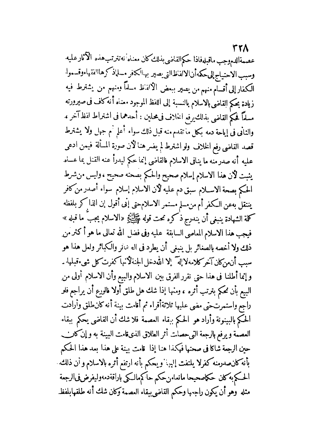 عِصْمَةُ الدَّمِ وَجَبُّ مَا قَبْلَهُ فَإِذَا حَكَمَ الْقَاضِي بِذَلِكَ كَانَ مَعْنَاهُ أَنَّهُ تَتَرَتَّبُ هَذِهِ الْآثَارُ عَلَيْهِ وَسَبَبُ الِاحْتِيَاجِ إلَى حُكْمِهِ أَنَّ الْأَلْفَاظَ الَّتِي يَصِيرُ بِهَا الْكَافِرُ مُسْلِمًا ذَكَرَهَا الْفُقَهَاءُ وَقَسَّمُوا الْكُفَّارَ إلَى أَقْسَامٍ مِنْهُمْ مَنْ يَصِيرُ بِبَعْضِ الْأَلْفَاظِ مُسْلِمًا وَمِنْهُمْ مَنْ يُشْتَرَطُ فِيهِ زِيَادَةٌ بِحُكْمِ الْقَاضِي بِالْإِسْلَامِ بِالنِّسْبَةِ إلَى اللَّفْظِ الْمَوْجُودِ مَعْنَاهُ أَنَّهُ كَافٍ فِي صَيْرُورَتِهِ مُسْلِمًا فَحُكْمُ الْقَاضِي بِذَلِكَ يَرْفَعُ الْخِلَافَ فِي مَحَلَّيْنِ: أَحَدُهُمَا فِي اشْتِرَاطِ لَفْظٍ آخَرَ، وَالثَّانِي فِي إبَاحَةِ دَمِهِ بِكُلِّ مَا تَقَدَّمَ مِنْهُ قَبْلَ ذَلِكَ سَوَاءٌ أَعَلِمَ أَمْ جَهِلَ وَلَا يُشْتَرَطُ قَصْدُ الْقَاضِي رَفْعِ الْخِلَافِ وَلَوْ اُشْتُرِطَ لَمْ يَضُرَّ هُنَا؛ لِأَنَّ صُورَةَ الْمَسْأَلَةِ فِيمَنْ اُدُّعِيَ عَلَيْهِ أَنَّهُ صَدَرَ مِنْهُ مَا يُنَافِي الْإِسْلَامَ فَالْقَاضِي إنَّمَا حَكَمَ لِيَدْرَأَ عَنْهُ الْقَتْلَ بِمَا عَسَاهُ يَثْبُتُ؛ لِأَنَّ هَذَا الْإِسْلَامَ إسْلَامٌ صَحِيحٌ، وَالْحُكْمُ بِصِحَّتِهِ صَحِيحٌ، وَلَيْسَ مِنْ شَرْطِ الْحُكْمِ بِصِحَّةِ الْإِسْلَامِ سَبْقُ دَمٍ عَلَيْهِ؛ لِأَنَّ الْإِسْلَامَ إسْلَامٌ، سَوَاءٌ أَصَدَرَ مِنْ كَافِرٍ يَنْتَقِلُ بِهِ عَنْ الْكُفْرِ أَمْ مِنْ مُسْلِمٍ مُسْتَمِرِّ الْإِسْلَامِ حَتَّى إنِّي أَقُولُ: إنَّ الذَّاكِرَ بِلَفْظِهِ كَلِمَةَ الشَّهَادَةِ يَنْبَغِي أَنْ يَنْدَرِجَ ذِكْرُهُ تَحْتَ قَوْلِهِ - صَلَّى اللَّهُ عَلَيْهِ وَسَلَّمَ - «الْإِسْلَامُ يَجُبُّ مَا قَبْلَهُ» فَيَجُبُّ هَذَا الْإِسْلَامُ الْمَعَاصِيَ السَّابِقَةَ عَلَيْهِ وَفِي فَضْلِ اللَّهِ تَعَالَى مَا هُوَ أَكْثَرُ مِنْ ذَلِكَ وَلَا أَخُصُّهُ بِالصَّغَائِرِ بَلْ يَنْبَغِي أَنْ يَطَّرِدَ فِي الصَّغَائِرِ وَالْكَبَائِرِ.