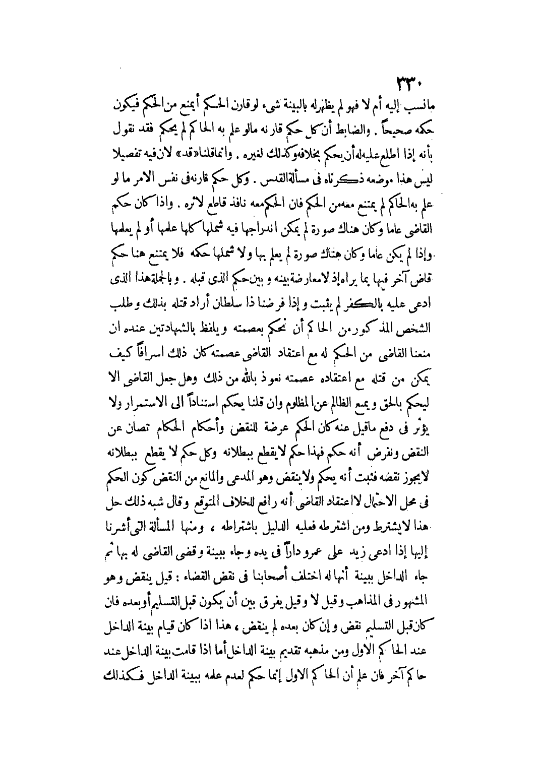 وَالضَّابِطُ أَنَّ كُلَّ حُكْمٍ قَارَنَهُ مَا لَوْ عَلِمَ بِهِ الْحَاكِمُ لَمْ يَحْكُمْ فَقَدْ نَقُولُ بِأَنَّهُ إذَا اطَّلَعَ عَلَيْهِ لَهُ أَنْ يَحْكُمَ بِخِلَافِهِ وَكَذَلِكَ لِغَيْرِهِ. وَإِنَّمَا قُلْنَا " قَدْ " لِأَنَّ فِيهِ تَفْصِيلًا لَيْسَ هَذَا مَوْضِعُهُ ذَكَرْنَاهُ فِي مَسْأَلَةِ الْقُدْسِ. وَكُلُّ حُكْمٍ قَارَنَهُ فِي نَفْسِ الْأَمْرِ مَا لَوْ عَلِمَ بِهِ الْحَاكِمُ لَمْ يَمْتَنِعْ مَعَهُ مِنْ الْحُكْمِ فَإِنَّ الْحُكْمَ مَعَهُ نَافِذٌ قَاطِعٌ لِأَثَرِهِ. وَإِذَا كَانَ حُكْمُ الْقَاضِي عَامًّا وَكَانَ هُنَاكَ صُورَةٌ لَمْ يُمْكِنْ انْدِرَاجُهَا فِيهِ شَمِلَهَا كُلَّهَا عَلِمَهَا أَوْ لَمْ يَعْلَمْهَا، وَإِذَا لَمْ يَكُنْ عَامًّا وَكَانَ هُنَاكَ صُورَةٌ لَمْ يَعْلَمْ بِهَا وَلَا شَمِلَهَا حُكْمُهُ فَلَا يَمْتَنِعُ هُنَا حُكْمُ قَاضٍ آخَرَ فِيهَا بِمَا يَرَاهُ إذْ لَا مُعَارَضَةُ بَيْنَهُ وَبَيْنَ حُكْمِ الَّذِي قَبْلَهُ. وَبِالْجُمْلَةِ هَذَا الَّذِي اُدُّعِيَ عَلَيْهِ بِالْكُفْرِ لَمْ يَثْبُتْ وَإِذَا فَرَضْنَا ذَا سُلْطَانٍ أَرَادَ قَتْلَهُ بِذَلِكَ وَطَلَبَ الشَّخْصُ الْمَذْكُورُ مِنْ الْحَاكِمِ أَنْ نَحْكُمَ بِعِصْمَتِهِ وَيَلْفِظُ بِالشَّهَادَتَيْنِ عِنْدَهُ إنْ مَنَعْنَا الْقَاضِي مِنْ الْحُكْمِ لَهُ مَعَ اعْتِقَادِ الْقَاضِي عِصْمَتَهُ كَانَ ذَلِكَ إسْرَافًا كَيْفَ يُمَكَّنُ مِنْ قَتْلِهِ مَعَ اعْتِقَادِهِ عِصْمَتَهُ - نَعُوذُ بِاَللَّهِ مِنْ ذَلِكَ - وَهَلْ جُعِلَ الْقَاضِي إلَّا لِيَحْكُمَ بِالْحَقِّ وَيَمْنَعَ الظَّالِمَ عَنْ الْمَظْلُومِ وَإِنْ قُلْنَا يَحْكُمُ اسْتِنَادًا إلَى الِاسْتِمْرَارِ وَلَا يُؤَثِّرُ فِي دَفْعِ مَا قِيلَ عَنْهُ كَانَ الْحُكْمُ عُرْضَةً لِلنَّقْضِ وَأَحْكَامُ الْحُكَّامِ تُصَانُ عَنْ النَّقْضِ وَنَفْرِضُ أَنَّهُ حَكَمَ فَهَذَا حُكْمٌ لَا يُقْطَعُ بِبُطْلَانِهِ وَكُلُّ حُكْمٍ لَا يُقْطَعُ بِبُطْلَانِهِ لَا يَجُوزُ نَقْضُهُ فَثَبَتَ أَنَّهُ يَحْكُمُ وَلَا يَنْقُضُ وَهُوَ الْمُدَّعِي وَالْمَانِعُ مِنْ النَّقْضِ كَوْنُ الْحُكْمِ فِي مَحَلِّ الِاحْتِمَالِ لَا اعْتِقَادِ الْقَاضِي أَنَّهُ رَافِعٌ لِلْخِلَافِ الْمُتَوَقَّعِ وَقَالَ: شِبْهُ ذَلِكَ حِلُّ هَذَا لَا يُشْتَرَطُ وَمَنْ اشْتَرَطَهُ فَعَلَيْهِ الدَّلِيلُ بِاشْتِرَاطِهِ.