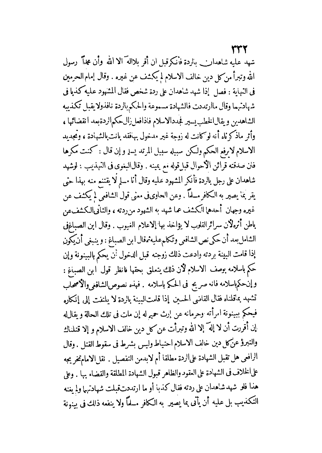 وَقَالَ ابْنُ الصَّبَّاغِ فِي الشَّامِلِ بَعْدَ أَنْ حَكَى نَصَّ الشَّافِعِيِّ وَتَكَلَّمَ عَلَيْهِ ثُمَّ قَالَ ابْنُ الصَّبَّاغِ: وَيَنْبَغِي أَنْ يَكُونَ إذَا قَامَتْ الْبَيِّنَةُ بِرِدَّتِهِ وَادَّعَتْ ذَلِكَ زَوْجَتُهُ قَبْلَ الدُّخُولِ أَنْ يَحْكُمَ بِالْبَيْنُونَةِ وَإِنْ حَكَمَ بِإِسْلَامِهِ بِوَصْفِ الْإِسْلَامِ؛ لِأَنَّ ذَلِكَ يَتَعَلَّقُ بِحَقِّهَا فَانْظُرْ قَوْلَ ابْنِ الصَّبَّاغِ: وَإِنْ حَكَمَ بِإِسْلَامِهِ فَإِنَّهُ صَرِيحٌ فِي الْحُكْمِ بِإِسْلَامِهِ. فَهَذِهِ نُصُوصُ الشَّافِعِيِّ وَالْأَصْحَابِ تَشْهَدُ بِمَا قُلْنَاهُ فَقَالَ الْقَاضِي الْحُسَيْنُ إذَا قَامَتْ الْبَيِّنَةُ بِالرِّدَّةِ لَا يَلْتَفِتُ إلَى إنْكَارِهِ فَيُحْكَمُ بِبَيْنُونَةِ امْرَأَتِهِ وَحِرْمَانِهِ عَنْ إرْثِ حَمِيمٍ لَهُ إنْ مَاتَ فِي تِلْكَ الْحَالَةِ وَيُقَالُ لَهُ: إنْ أَقْرَرْت أَنْ لَا إلَهَ إلَّا اللَّهُ وَتَبَرَّأْت عَنْ كُلِّ دِينٍ خَالَفَ الْإِسْلَامَ وَإِلَّا قَتَلْنَاكَ وَالتَّبَرُّؤُ عَنْ كُلِّ دِينٍ خَالَفَ الْإِسْلَام احْتِيَاطٌ وَلَيْسَ بِشَرْطٍ فِي سُقُوطِ الْقَتْلِ.