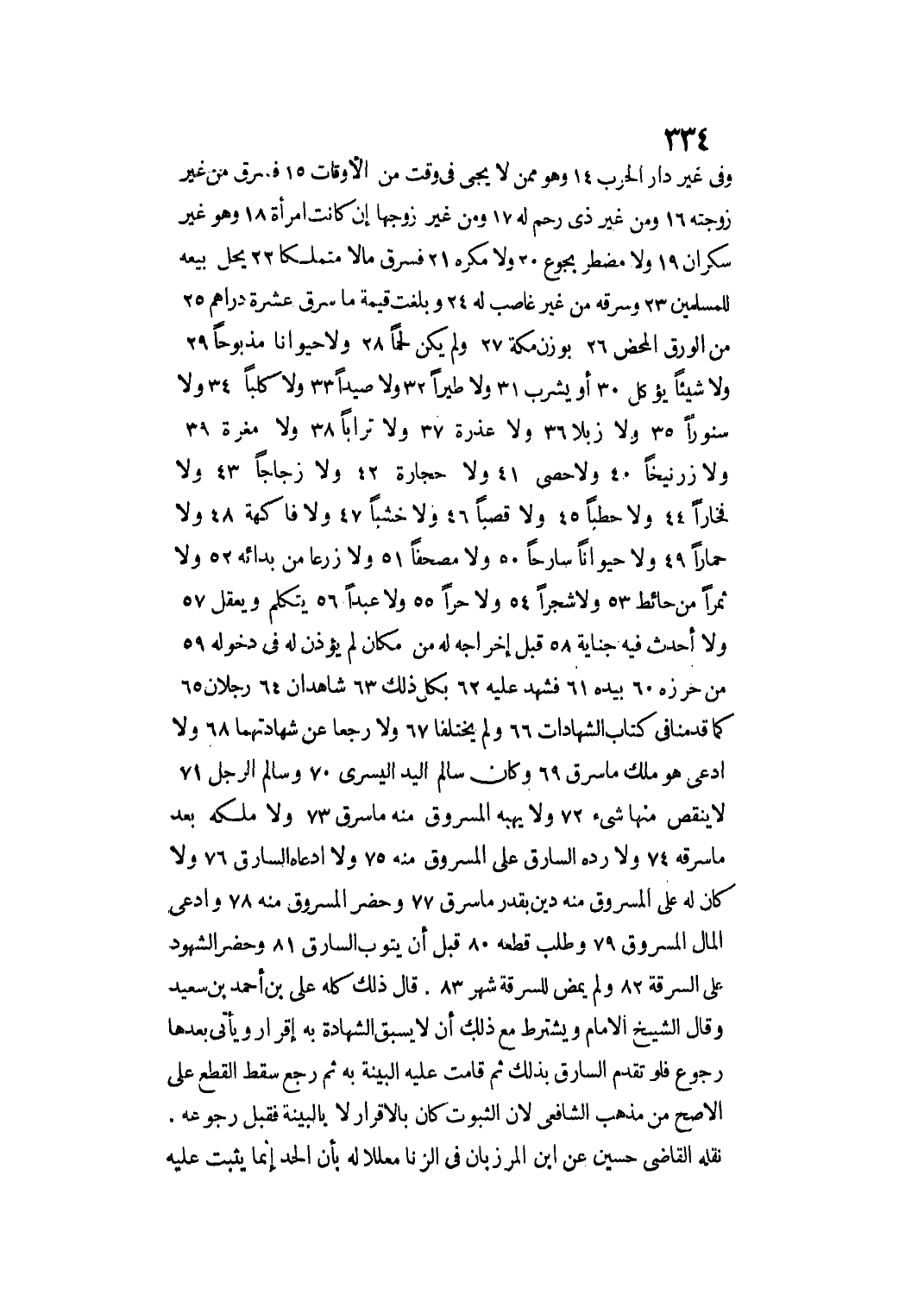 وَفِي غَيْرِ دَارِ الْحَرْبِ - 14 وَهُوَ مِمَّنْ لَا يَجِيءُ فِي وَقْتٍ مِنْ الْأَوْقَاتِ - 15 فَسَرَقَ مِنْ غَيْرِ زَوْجَتِهِ - 16 وَمِنْ غَيْرِ ذِي رَحِمٍ لَهُ - 17 وَمِنْ غَيْرِ زَوْجِهَا إنْ كَانَتْ امْرَأَةً - 18 وَهُوَ غَيْرُ سَكْرَانَ - 19 وَلَا مُضْطَرٍّ بِجُوعٍ - 20 وَلَا مُكْرَهٍ - 21 فَسَرَقَ مَالًا مُتَمَلَّكًا - 22 يَحِلُّ بَيْعُهُ لِلْمُسْلِمِينَ - 23 وَسَرَقَهُ مِنْ غَيْرِ غَاصِبٍ لَهُ - 24 وَبَلَغَتْ قِيمَةُ مَا سَرَقَ عَشَرَةَ دَرَاهِمَ - 25 مِنْ الْوَرِقِ الْمَحْضِ - 26 بِوَزْنِ مَكَّةَ - 27 وَلَمْ يَكُنْ لَحْمًا - 28 وَلَا حَيَوَانًا مَذْبُوحًا - 29 وَلَا شَيْئًا يُؤْكَلُ - 30 أَوْ يُشْرَبُ - 31 وَلَا طَيْرًا - 32 وَلَا صَيْدًا - 33 وَلَا كَلْبًا - 34 وَلَا سِنَّوْرًا - 35 وَلَا زِبْلًا - 36 وَلَا عَذِرَةً - 37 وَلَا تُرَابًا - 38 وَلَا مَغْرَةً - 39 وَلَا زِرْنِيخًا - 40 وَلَا حَصًى - 41 وَلَا حِجَارَةً - 42 وَلَا زُجَاجًا - 43 وَلَا فَخَّارًا - 44 وَلَا حَطَبًا - 45 وَلَا قَصَبًا - 46 وَلَا خَشَبًا - 47 وَلَا فَاكِهَةً - 48 وَلَا حِمَارًا - 49 وَلَا حَيَوَانًا سَارِحًا - 50 وَلَا مُصْحَفًا - 51 وَلَا زَرْعًا مِنْ بَدَائِهِ - 52 وَلَا ثَمَرًا مِنْ حَائِطٍ - 53 وَلَا شَجَرًا - 54 وَلَا حُرًّا - 55 وَلَا عَبْدًا - 56 يَتَكَلَّمُ وَيَعْقِلُ - 57 وَلَا أَحْدَثَ فِيهِ جِنَايَةً - 58 قَبْلَ إخْرَاجِهِ لَهُ مِنْ مَكَان لَمْ يُؤْذَنْ لَهُ فِي دُخُولِهِ - 59 مِنْ حِرْزِهِ - 60 بِيَدِهِ - 61 فَشَهِدَ عَلَيْهِ - 62 بِكُلِّ ذَلِكَ - 63 شَاهِدَانِ - 64 رَجُلَانِ - 65 كَمَا قَدَّمْنَا فِي كِتَابِ الشَّهَادَاتِ - 66 وَلَمْ يَخْتَلِفَا - 67 وَلَا رَجَعَا عَنْ شَهَادَتِهِمَا - 68 وَلَا ادَّعَى هُوَ مِلْكَ مَا سَرَقَ - 69 وَكَانَ سَالِمَ الْيَدَ الْيُسْرَى - 70 وَسَالِمَ الرِّجْلِ - 71 لَا يُنْقَصُ مِنْهَا شَيْءٌ - 72 وَلَا يَهَبُهُ الْمَسْرُوقُ مِنْهُ مَا سَرَقَ - 73 وَلَا مَلَكَهُ بَعْدَمَا سَرَقَهُ - 74 وَلَا رَدَّهُ السَّارِقُ عَلَى الْمَسْرُوقِ مِنْهُ - 75 وَلَا ادَّعَاهُ السَّارِقُ - 76 وَلَا كَانَ لَهُ عَلَى الْمَسْرُوقِ مِنْهُ دَيْنٌ بِقَدْرِ مَا سَرَقَ - 77 وَحَضَرَ الْمَسْرُوقُ مِنْهُ - 78 وَادَّعَى الْمَالَ الْمَسْرُوقَ - 79 وَطَلَبَ قَطْعَهُ - 80 قَبْلَ أَنْ يَتُوبَ السَّارِقُ - 81 وَحَضَرَ الشُّهُودُ عَلَى السَّرِقَةِ - 82 وَلَمْ يَمْضِ لِلسَّرِقَةِ شَهْرٌ - 83. قَالَ ذَلِكَ كُلَّهُ عَلِيُّ بْنُ أَحْمَدَ بْنِ سَعِيدٍ وَقَالَ الشَّيْخُ الْإِمَامُ وَيُشْتَرَطُ مَعَ ذَلِكَ أَنْ لَا يَسْبِقَ الشَّهَادَةَ بِهِ إقْرَارٌ وَيَأْتِيَ بَعْدَهَا رُجُوعٌ فَلَوْ تَقَدَّمَ السَّارِقُ بِذَلِكَ، ثُمَّ قَامَتْ عَلَيْهِ الْبَيِّنَةُ بِهِ ثُمَّ رَجَعَ سَقَطَ الْقَطْعُ عَلَى الْأَصَحِّ مِنْ مَذْهَبِ الشَّافِعِيِّ - رَحِمَهُ اللَّهُ - لِأَنَّ الثُّبُوتَ كَانَ بِالْإِقْرَارِ لَا بِالْبَيِّنَةِ فَقُبِلَ رُجُوعُهُ.
