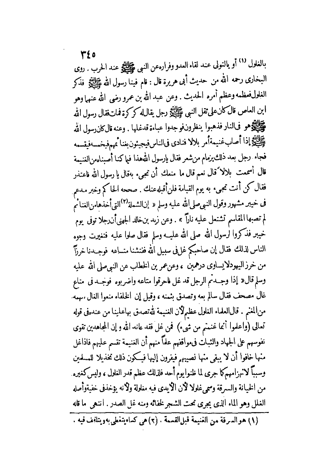 رَوَى الْبُخَارِيُّ - رَحِمَهُ اللَّهُ - مِنْ حَدِيثِ أَبِي هُرَيْرَةَ قَالَ: «قَامَ فِينَا رَسُولُ اللَّهِ - صَلَّى اللَّهُ عَلَيْهِ وَسَلَّمَ - فَذَكَرَ الْغُلُولَ فَعَظَّمَهُ وَعَظَّمَ أَمْرَهُ» الْحَدِيثَ. وَعَنْ عَبْدِ اللَّهِ بْنِ عَمْرٍو - رَضِيَ اللَّهُ عَنْهُمَا - وَهُوَ ابْنُ الْعَاصِ قَالَ «كَانَ عَلَى ثَقَلِ النَّبِيِّ - صَلَّى اللَّهُ عَلَيْهِ وَسَلَّمَ - رَجُلٌ يُقَالُ لَهُ: كِرْكِرَةُ فَمَاتَ فَقَالَ رَسُولُ اللَّهِ - صَلَّى اللَّهُ عَلَيْهِ وَسَلَّمَ - هُوَ فِي النَّارِ فَذَهَبُوا يَنْظُرُونَ فَوَجَدُوا عَبَاءَةً قَدْ غَلَّهَا» . وَعَنْهُ قَالَ «كَانَ رَسُولُ اللَّهِ - صَلَّى اللَّهُ عَلَيْهِ وَسَلَّمَ - إذَا أَصَابَ غَنِيمَةً أَمَرَ بِلَالًا فَنَادَى فِي النَّاسِ فَيَجِيئُونَ بِغَنَائِمِهِمْ فَيُخَمِّسُهُ فَيَقْسِمُهُ فَجَاءَ رَجُلٌ بَعْدَ ذَلِكَ بِزِمَامٍ مِنْ شَعْرٍ فَقَالَ يَا رَسُولَ اللَّهِ هَذَا فِيمَا كُنَّا أَصَبْنَاهُ مِنْ الْغَنِيمَةِ قَالَ أَسَمِعْتَ بِلَالًا قَالَ نَعَمْ قَالَ مَا مَنَعَكَ أَنْ تَجِيءَ بِهِ؟ قَالَ يَا رَسُولَ اللَّهِ فَاعْتَذَرَ، فَقَالَ كُنْ أَنْتَ تَجِيءُ بِهِ يَوْمَ الْقِيَامَةِ فَلَنْ أَقْبَلَهُ عَنْك» . صَحَّحَهُ الْحَاكِمُ.