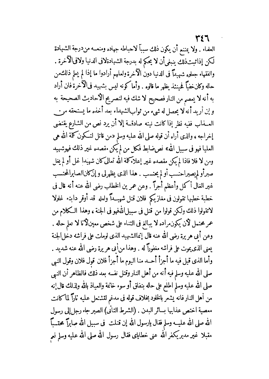 وَأَمَّا كَوْنُهُ لَيْسَ بِشَهِيدٍ فِي الْآخِرَةِ فَإِنْ أَرَادَ بِهِ أَنَّهُ لَا يُعْصَمُ مِنْ النَّارِ فَصَحِيحٌ لَا شَكَّ فِيهِ لِتَصْرِيحِ الْأَحَادِيثِ الصَّحِيحَةِ بِهِ وَإِنْ أُرِيدَ أَنَّهُ لَا يَحْصُلُ لَهُ شَيْءٌ مِنْ ثَوَابِ الشُّهَدَاءِ بَعْدَ أَخْذِهِ مَا يَسْتَحِقُّهُ مِنْ الْعَذَابِ فَفِيهِ نَظَرٌ إذَا كَانَتْ نِيَّتُهُ صَادِقَةً إلَّا أَنْ يَرِدَ نَصٌّ مِنْ الشَّارِعِ يَقْتَضِي إخْرَاجَهُ، وَاَلَّذِي أَرَاهُ أَنَّ قَوْلَهُ - صَلَّى اللَّهُ عَلَيْهِ وَسَلَّمَ - «مَنْ قَاتَلَ لِتَكُونَ كَلِمَةُ اللَّهِ هِيَ الْعُلْيَا فَهُوَ فِي سَبِيلِ اللَّهِ» نَصًّا ضَابِطًا فَكُلُّ مَنْ لَمْ يَكُنْ مَقْصِدُهُ غَيْرَ ذَلِكَ فَهُوَ شَهِيدٌ وَمَنْ لَا فَلَا فَإِذَا لَمْ يَكُنْ مَقْصِدُهُ غَيْرَ إعْلَاءِ كَلِمَةِ اللَّهِ تَعَالَى كَانَ شَهِيدًا غَلَّ أَوْ لَمْ يَغُلَّ صَبَرَ أَوْ لَمْ يَصْبِرْ احْتَسَبَ أَوْ لَمْ يَحْتَسِبْ. هَذَا الَّذِي يَظْهَرُ لِي وَإِنْ كَانَ الصَّابِرُ الْمُحْتَسِبُ غَيْرُ الْغَالِّ أَكْمَلَ وَأَعْظَمَ أَجْرًا. وَعَنْ عُمَرَ بْنِ الْخَطَّابِ - رَضِيَ اللَّهُ عَنْهُ - أَنَّهُ قَالَ فِي خُطْبَةٍ خَطَبَهَا: تَقُولُونَ فِي مَغَازِيكُمْ فُلَانٌ قُتِلَ شَهِيدًا وَلَعَلَّهُ قَدْ أَوْقَرَ دَابَّتَهُ غُلُولًا لَا تَقُولُوا ذَلِكَ وَلَكِنْ قُولُوا مَنْ قُتِلَ فِي سَبِيلِ اللَّهِ فَهُوَ فِي الْجَنَّةِ، وَهَذَا الْكَلَامُ مِنْ عُمَرَ مُحْتَمِلٌ لَأَنْ يَكُونَ مُرَادُهُ لَا يُبَالِغُ فِي الثَّنَاءِ عَلَى شَخْصٍ مُعَيَّنٍ؛ لِأَنَّا لَا نَعْلَمُ.