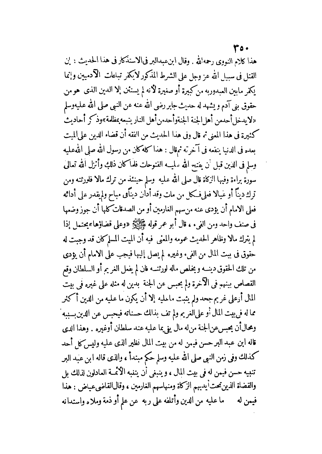 وَقَالَ ابْنُ عَبْدِ الْبَرِّ فِي الِاسْتِذْكَارِ فِي هَذَا الْحَدِيثِ: إنَّ الْقَتْلَ فِي سَبِيلِ اللَّهِ عَزَّ وَجَلَّ عَلَى الشَّرْطِ الْمَذْكُورِ لَا يُكَفِّرُ تَبَاعَاتِ الْآدَمِيِّينَ وَإِنَّمَا يُكَفِّرُ مَا بَيْنَ الْعَبْدِ وَرَبِّهِ مِنْ كَبِيرَةٍ أَوْ صَغِيرَةٍ؛ لِأَنَّهُ لَمْ يَسْتَثْنِ إلَّا الدَّيْنَ الَّذِي هُوَ مِنْ حُقُوقِ بَنَى آدَمَ وَيَشْهَدُ لَهُ حَدِيثُ جَابِرٍ - رَضِيَ اللَّهُ عَنْهُ - عَنْ النَّبِيِّ - صَلَّى اللَّهُ عَلَيْهِ وَسَلَّمَ - «لَا يَدْخُلُ أَحَدٌ مِنْ أَهْلِ الْجَنَّةِ الْجَنَّةَ وَأَحَدٌ مِنْ أَهْلِ النَّارِ يَتْبَعُهُ بِمَظْلِمَةٍ» وَذَكَرَ أَحَادِيثًا كَثِيرَةً فِي هَذَا الْمَعْنَى، ثُمَّ قَالَ: وَفِي هَذَا الْحَدِيثِ مِنْ الْفِقْهِ أَنَّ قَضَاءَ الدَّيْنِ عَلَى الْمَيِّتِ بَعْدَهُ فِي الدُّنْيَا يَنْفَعُهُ فِي آخِرَتِهِ.