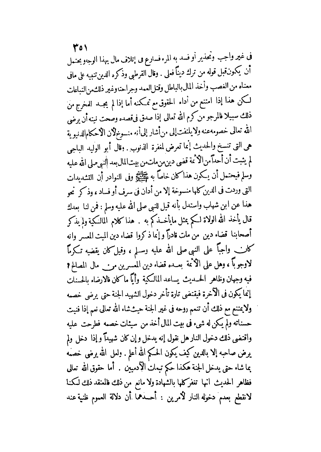 وَقَالَ الْقُرْطُبِيُّ وَذِكْرُهُ الدَّيْنَ تَنْبِيهٌ عَلَى مَا فِي مَعْنَاهُ مِنْ الْغَصْبِ وَأَخْذِ الْمَالِ بِالْبَاطِلِ وَقَتْلِ الْعَمْدِ وَجِرَاحَتِهِ وَغَيْرِ ذَلِكَ مِنْ التَّبَاعَاتِ لَكِنْ هَذَا إذَا امْتَنَعَ مِنْ أَدَاءِ الْحُقُوقِ مَعَ تَمَكُّنِهِ أَمَّا إذَا لَمْ يَجِدْ الْمَخْرَجَ مِنْ ذَلِكَ سَبِيلًا فَالْمَرْجُوُّ مِنْ كَرَمِ اللَّهِ تَعَالَى إذَا صَدَقَ فِي قَصْدِهِ وَصَحَّتْ نِيَّتُهُ أَنْ يُرْضِيَ اللَّهُ تَعَالَى خُصُومَهُ عَنْهُ وَلَا يُلْتَفَتُ إلَى مَنْ أَشَارَ إلَى أَنَّهُ مَنْسُوخٌ؛ لِأَنَّ الْأَحْكَامَ الدُّنْيَوِيَّةَ هِيَ الَّتِي تُنْسَخُ وَالْحَدِيثُ إنَّمَا تَعَرَّضَ لِمَغْفِرَةِ الذُّنُوبِ.