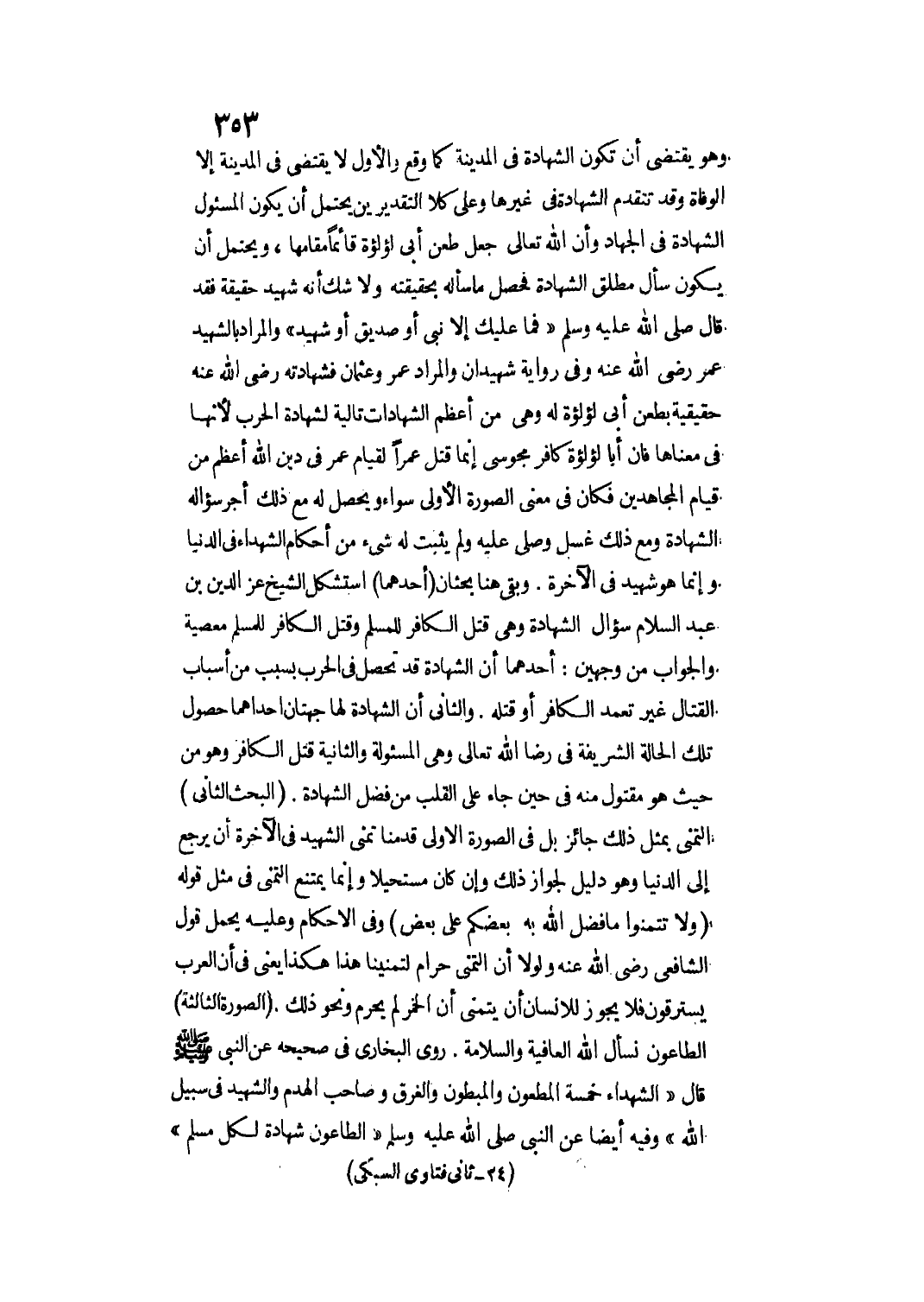 وَالثَّانِي أَنَّ الشَّهَادَةَ لَهَا جِهَتَانِ: إحْدَاهُمَا حُصُولُ تِلْكَ الْحَالَةِ الشَّرِيفَةِ فِي رِضَا اللَّهِ تَعَالَى وَهِيَ الْمَسْئُولَةُ وَالثَّانِيَةُ قَتْلُ الْكَافِرِ وَهُوَ مِنْ حَيْثُ هُوَ مَقْتُولٌ مِنْهُ فِي حِينِ جَاءَ عَلَى الْقَلْبِ مِنْ فَضْلِ الشَّهَادَةِ. (الْبَحْثُ الثَّانِي) التَّمَنِّي بِمِثْلِ ذَلِكَ جَائِزٌ بَلْ فِي الصُّورَةِ الْأُولَى قَدَّمْنَا تَمَنِّي الشَّهِيدِ فِي الْآخِرَةِ أَنْ يَرْجِعَ إلَى الدُّنْيَا وَهُوَ دَلِيلٌ لِجَوَازِ ذَلِكَ وَإِنْ كَانَ مُسْتَحِيلًا وَإِنَّمَا يَمْتَنِعُ التَّمَنِّي فِي مِثْلِ قَوْلِهِ {وَلا تَتَمَنَّوْا مَا فَضَّلَ اللَّهُ بِهِ بَعْضَكُمْ عَلَى بَعْضٍ} [النساء: 32] وَفِي الْأَحْكَامِ وَعَلَيْهِ يُحْمَلُ قَوْلُ الشَّافِعِيِّ - رَضِيَ اللَّهُ عَنْهُ - وَلَوْلَا أَنَّ التَّمَنِّي حَرَامٌ لَتَمَنَّيْنَا هَذَا هَكَذَا يَعْنِي فِي أَنَّ الْعَرَبَ يَسْتَرِقُونَ فَلَا يَجُوزُ لِلْإِنْسَانِ أَنْ يَتَمَنَّى أَنَّ الْخَمْرَ لَمْ يُحَرَّمْ وَنَحْوَ ذَلِكَ. (الصُّورَةُ الثَّالِثَةُ) الطَّاعُونُ نَسْأَلُ اللَّهُ الْعَافِيَةَ وَالسَّلَامَةَ. رَوَى الْبُخَارِيُّ فِي صَحِيحِهِ عَنْ النَّبِيِّ - صَلَّى اللَّهُ عَلَيْهِ وَسَلَّمَ - قَالَ «الشُّهَدَاءُ خَمْسَةٌ: الْمَطْعُونُ وَالْمَبْطُونُ وَالْغَرِقُ وَصَاحِبُ الْهَدْمِ وَالشَّهِيدُ فِي سَبِيلِ اللَّهِ» وَفِيهِ أَيْضًا عَنْ النَّبِيِّ - صَلَّى اللَّهُ عَلَيْهِ وَسَلَّمَ - «الطَّاعُونُ شَهَادَةٌ لِكُلِّ مُسْلِمٍ»