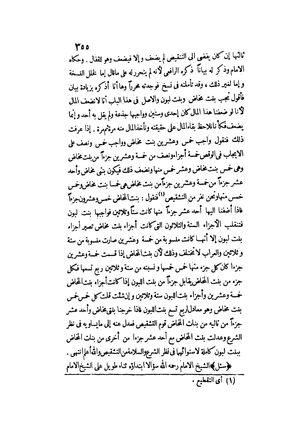 ثَالِثُهَا إنْ كَانَ يُفْضِي إلَى التَّنْقِيصِ لَمْ يُضَعَّفْ وَإِلَّا فَيُضَعَّفُ وَهُوَ لِلْقَفَّالِ. وَحَكَاهُ الْإِمَامُ وَذَكَرَ لَهُ بَيَانًا ذَكَرَهُ الرَّافِعِيُّ؛ لِأَنَّهُ لَمْ يَتَحَرَّرْ لَهُ عَلَى مَا قَالَ إمَّا لِخَلَلِ النُّسْخَةِ وَإِمَّا لِغَيْرِ ذَلِكَ، وَقَدْ تَأَمَّلْتُهُ فِي نُسَخٍ فَوَجَدْتُهُ مُحَرَّرًا وَهَا أَنَا أَذْكُرُهُ بِزِيَادَةِ بَيَانٍ، فَأَقُولُ تَجِبُ بِنْتُ مَخَاضٍ وَبِنْتُ لَبُونٍ وَالْأَصْلُ فِي هَذَا الْبَابِ أَنَّا لَا نُضَعَّفُ الْمَالَ؛ لِأَنَّا لَوْ ضَعَّفْنَا هَذَا الْمَالَ كَانَ إحْدَى وَسِتِّينَ وَوَاجِبُهَا جَذَعَةٌ وَلَمْ يَقُلْ بِهِ أَحَدٌ وَإِنَّمَا يُضَعَّفُ فَكَأَنَّا نُلَاحِظُ بَقَاءَ الْمَالِ عَلَى حَقِيقَتِهِ وَنَأْخُذُ الْمَالَ مِنْهُ مَرَّةً، ثُمَّ مَرَّةً. إذَا عَرَفْت ذَلِكَ فَنَقُولُ: وَاجِبُ خَمْسٍ وَعِشْرِينَ بِنْتُ مَخَاضٍ وَوَاجِبُ خَمْسٍ وَنِصْفٍ عَلَى الْإِيجَابِ فِي الْوَقْصِ خَمْسَةُ أَجْزَاءٍ وَنِصْفٍ مِنْ خَمْسَةٍ وَعِشْرِينَ جُزْءًا مِنْ بِنْتِ مَخَاضٍ وَهِيَ خُمُسُ بِنْتِ مَخَاضٍ وَعُشْرُ خُمُسٍ مِنْهَا وَنُضَعِّفُ ذَلِكَ فَيَكُونُ بِنْتَيْ مَخَاضٍ وَأَحَدَ عَشَرَ جُزْءًا مِنْ خَمْسَةٍ وَعِشْرِينَ جُزْءًا مِنْ بِنْتِ مَخَاضٍ هِيَ خُمُسَا بِنْتِ مَخَاضٍ وَخُمُسُ خُمُسٍ مِنْهَا وَنَحْنُ نَفِرَّ مِنْ التَّشْقِيصِ فَنَقُولُ: بِنْتُ الْمَخَاضِ خَمْسٌ وَعِشْرُونَ جُزْءًا فَإِذَا أَضَفْنَا إلَيْهَا أَحَدَ عَشْرَ جُزْءًا مِنْهَا كَانَتْ سِتًّا وَثَلَاثِينَ فَوَاجِبُهَا بِنْتُ لَبُونٍ فَتَنْقَلِبُ الْأَجْزَاءُ السِّتَّةُ وَالثَّلَاثُونَ الَّتِي كَانَتْ أَجْزَاءَ بِنْتِ مَخَاضٍ تَصِيرُ أَجْزَاءَ بِنْتِ لَبُونٍ إلَّا أَنَّهَا كَانَتْ مَنْسُوبَةً مِنْ خَمْسَةٍ وَعِشْرِينَ صَارَتْ مَنْسُوبَةً مِنْ سِتَّةٍ وَثَلَاثِينَ وَالْعِرَابُ لَا تَخْتَلِفُ وَذَلِكَ؛ لِأَنَّ بِنْتَ الْمَخَاضِ إذَا قُسِّمَتْ خَمْسَةً وَعِشْرِينَ جُزْءًا كَانَ كُلُّ جُزْءٍ مِنْهَا خُمُسَ خُمُسِهَا وَنِسْبَتُهُ مِنْ سِتَّةِ وَثَلَاثِينَ رُبُعِ تُسْعِهَا فَكُلُّ جُزْءٍ مِنْ بِنْتِ الْمَخَاضِ يُقَابِلُ جُزْءًا مِنْ بِنْت اللَّبُونِ إذَا كَانَتْ أَجْزَاءُ بِنْتِ الْمَخَاضِ خَمْسَةً وَعِشْرِينَ وَأَجْزَاءُ بِنْتِ اللَّبُونِ سِتَّةً وَثَلَاثِينَ وَإِنْ شِئْت قُلْت: كُلُّ خُمُسِ خُمُسِ بِنْتِ مَخَاضٍ وَهُوَ مُعَادِلٌ لِرُبُعِ تُسْعِ بِنْتِ اللَّبُونِ فَإِذَا خَرَّجْنَا بِنْتَيْ مَخَاضٍ وَأَحَدَ عَشْرَ جُزْءًا مِنْ تَالِيهِ مِنْ بَنَاتِ الْمَخَاضِ قُوِّمَ التَّشْقِيصُ فَعُدِلَ عَنْهُ إلَى مَا يُسَاوِيهِ فِي نَظَرِ الشَّرْعِ وَعَدَلَتْ بِنْتُ الْمَخَاضِ مَعَ أَحَدَ عَشْرَ جُزْءًا مِنْ أُخْرَى مِنْ بَنَاتِ الْمَخَاضِ بِبِنْتِ لَبُونٍ كَامِلَةٍ لِاسْتِوَائِهِمَا فِي نَظَرِ الشَّرْعِ وَالسَّلَامَةِ مِنْ التَّشْقِيصِ وَاَللَّهُ أَعْلَمُ انْتَهَى.