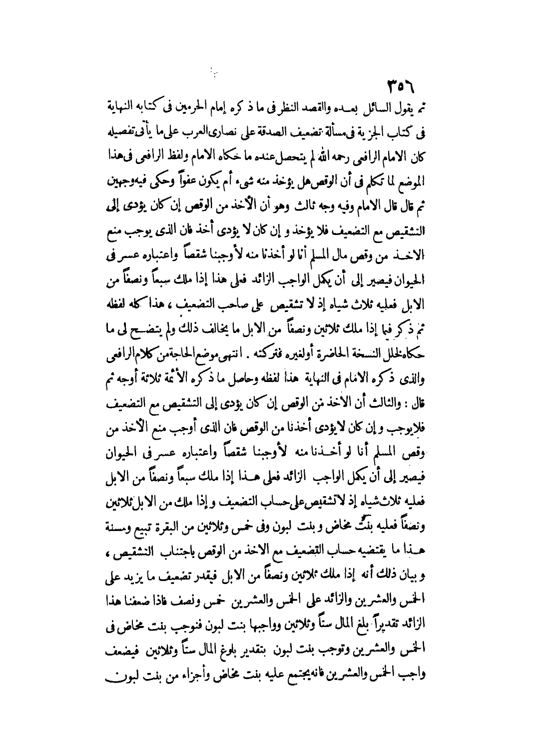 هَذَا كُلُّهُ لَفْظُهُ، ثُمَّ ذَكَرَ فِيمَا إذَا مَلَكَ ثَلَاثِينَ وَنِصْفًا مِنْ الْإِبِلِ مَا يُخَالِفُ ذَلِكَ وَلَمْ يَتَّضِحْ لِي مَا حَكَاهُ لِخَلَلِ النُّسْخَةِ الْحَاضِرَةِ أَوْ لِغَيْرِهِ فَتَرَكْته. انْتَهَى مَوْضِعُ الْحَاجَةِ مِنْ كَلَامِ الرَّافِعِيِّ وَاَلَّذِي ذَكَرَهُ الْإِمَامُ فِي النِّهَايَةِ هَذَا لَفْظُهُ وَحَاصِلُ مَا ذَكَرَهُ الْأَئِمَّةُ ثَلَاثَةُ أَوْجُهٍ، ثُمَّ قَالَ: وَالثَّالِثُ أَنَّ الْأَخْذَ مِنْ الْوَقْصِ إنْ كَانَ يُؤَدِّي إلَى التَّشْقِيصِ مَعَ التَّضْعِيفِ فَلَا يُوجِبُ وَإِنْ كَانَ لَا يُؤَدِّي أَخَذْنَا مِنْ الْوَقْصِ فَإِنَّ الَّذِي أَوْجَبَ مَنْعَ الْأَخْذِ مِنْ وَقْصِ الْمُسْلِمِ أَنَّا لَوْ أَخَذْنَا مِنْهُ لَأَوْجَبْنَا شِقْصًا وَاعْتِبَارُهُ عُسْرٌ فِي الْحَيَوَانِ فَيَصِيرُ إلَى أَنْ يَكْمُلَ الْوَاجِبُ الزَّائِدُ، فَعَلَى هَذَا إذَا مَلَكَ سَبْعًا وَنِصْفًا مِنْ الْإِبِلِ فَعَلَيْهِ ثَلَاثُ شِيَاهٍ إذْ لَا تَشْقِيصَ عَلَى حِسَابِ التَّضْعِيفِ، وَإِذَا مَلَكَ مِنْ الْإِبِلِ ثَلَاثِينَ وَنِصْفًا فَعَلَيْهِ بِنْتُ مَخَاضٍ وَبِنْتُ لَبُونٍ وَفِي خَمْسِ وَثَلَاثِينَ مِنْ الْبَقَرَةِ تَبِيعُ وَمُسِنَّةٌ هَذَا مَا يَقْتَضِيهِ حِسَابُ التَّضْعِيفِ مَعَ الْأَخْذِ مِنْ الْوَقْصِ بِاجْتِنَابِ التَّشْقِيصِ، وَبَيَانُ ذَلِكَ أَنَّهُ إذَا مَلَكَ ثَلَاثِينَ وَنِصْفًا مِنْ الْإِبِلِ فَيُقَدَّرُ تَضْعِيفُ مَا يَزِيدُ عَلَى الْخَمْسِ وَالْعِشْرِينَ، وَالزَّائِدُ عَلَى الْخَمْسِ وَالْعِشْرِينَ خُمُسٌ وَنِصْفٌ فَإِذَا ضَعَّفْنَا هَذَا الزَّائِدَ تَقْدِيرًا بَلَغَ الْمَالُ سِتًّا وَثَلَاثِينَ وَوَاجِبُهَا بِنْتُ لَبُونٍ فَنُوجِبُ بِنْتَ مَخَاضٍ فِي الْخَمْسِ وَالْعِشْرِينَ وَنُوجِبُ بِنْتَ لَبُونٍ بِتَقْدِيرِ بُلُوغِ الْمَالِ سِتًّا وَثَلَاثِينَ فَيُضَعَّف وَاجِبُ الْخَمْسِ وَالْعِشْرِينَ فَإِنَّهُ يَجْتَمِعُ عَلَيْهِ بِنْتُ مَخَاضٍ وَأَجْزَاءٌ مِنْ بِنْتِ لَبُونٍ