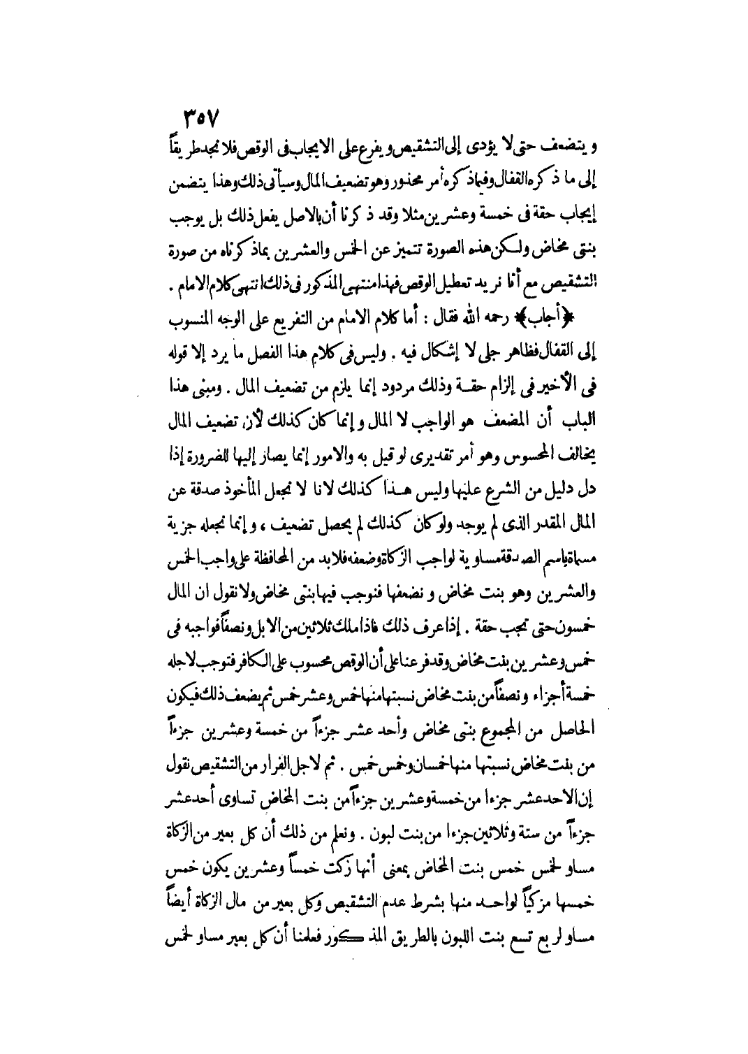 (أَجَابَ) - رَحِمَهُ اللَّهُ - فَقَالَ: أَمَّا كَلَامُ الْإِمَامِ مِنْ التَّفْرِيعِ عَلَى الْوَجْهِ الْمَنْسُوبِ إلَى الْقَفَّالِ فَظَاهِرٌ جَلِيٌّ لَا إشْكَالَ فِيهِ. وَلَيْسَ فِي كَلَامِ هَذَا الْفَصْلِ مَا يُرَدُّ إلَّا قَوْلُهُ فِي الْأَخِيرِ فِي إلْزَامِ حِقَّةٍ وَذَلِكَ مَرْدُودٌ إنَّمَا يَلْزَمُ مِنْ تَضْعِيفِ الْمَالِ.