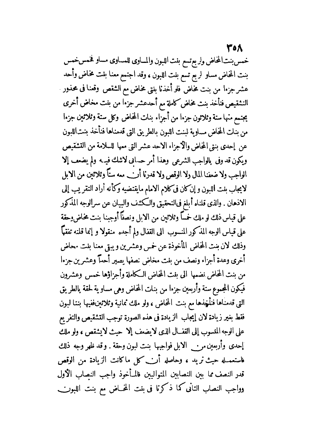 وَاَلَّذِي قُلْنَاهُ أَبْلَغُ فِي التَّحْقِيقِ وَالْكَشْفِ وَالْبَيَانِ عَنْ سِرِّ الْوَجْهِ الْمَذْكُورِ عَلَى قِيَاسِ ذَلِكَ لَوْ مَلَكَ خَمْسًا وَثَلَاثِينَ مِنْ الْإِبِلِ وَنِصْفًا أَوْجَبْنَا بِنْتَ مَخَاضٍ وَحِقَّةً عَلَى قِيَاسِ الْوَجْهِ الْمَذْكُورِ الْمَنْسُوبِ إلَى الْقَفَّالِ وَلَمْ أَجِدْهُ مَنْقُولًا وَإِنَّمَا قُلْتُهُ تَفَقُّهًا وَذَلِكَ؛ لِأَنَّ بِنْتَ الْمَخَاضِ الْمَأْخُوذَةَ عَنْ خَمْسٍ وَعِشْرِينَ وَيَبْقَى مَعَنَا بِنْتُ مَخَاضٍ أُخْرَى وَعِدَّةُ أَجْزَاءٍ وَنِصْفٌ مِنْ بِنْتِ مَخَاضٍ نِصْفُهَا يَصِيرُ أَحَدًا وَعِشْرِينَ جُزْءًا مِنْ بِنْتِ الْمَخَاضِ نَضُمُّهَا إلَى بِنْتِ الْمَخَاضِ الْكَامِلَةِ، وَأَجْزَاؤُهَا خَمْسُ وَعِشْرُونَ فَيَكُونُ الْمَجْمُوعُ سِتَّةً وَأَرْبَعِينَ جُزْءًا مِنْ بَنَاتِ الْمَخَاضِ وَهِيَ مُسَاوِيَةٌ لِحَقَّةٍ بِالطَّرِيقِ الَّتِي قَدَّمْنَاهَا فَنَأْخُذُهَا مَعَ بِنْتِ الْمَخَاضِ، وَلَوْ مَلَكَ ثَمَانِيَةً وَثَلَاثِينَ فَفِيهَا بِنْتَا لَبُونٍ فَقَطْ بِغَيْرِ زِيَادَةٍ؛ لِأَنَّ إيجَابَ الزِّيَادَةِ فِي هَذِهِ الصُّورَةِ تُوجِبُ التَّشْقِيصَ، وَالتَّفْرِيعَ عَلَى الْوَجْه الْمَنْسُوبِ إلَى الْقَفَّالِ الَّذِي لَا يُضَعَّفُ إلَّا حَيْثُ لَا يُشَقَّصُ، وَلَوْ مَلَكَ إحْدَى وَأَرْبَعِينَ مِنْ الْإِبِلِ فَوَاجِبُهَا بِنْتُ لَبُونٍ وَحِقَّةٌ.