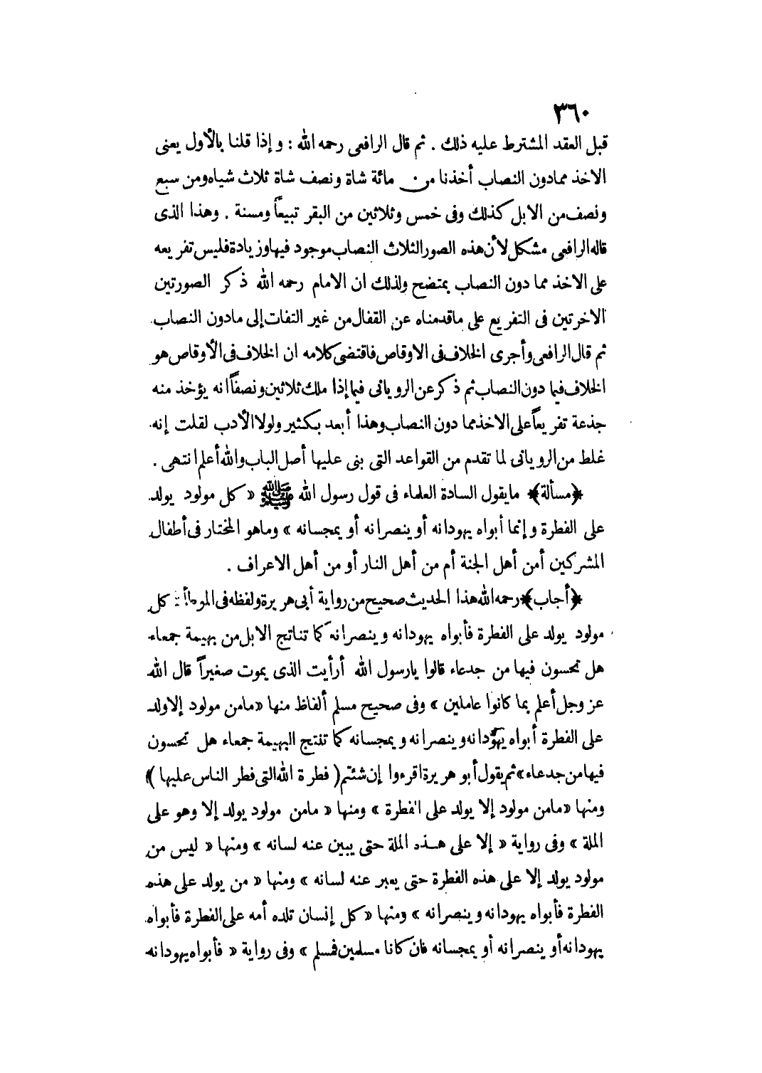ثُمَّ قَالَ الرَّافِعِيُّ - رَحِمَهُ اللَّهُ -: وَإِذَا قُلْنَا بِالْأَوَّلِ يَعْنِي الْأَخْذَ مِمَّا دُونَ النِّصَابِ أَخَذْنَا مِنْ مِائَةِ شَاةٍ وَنِصْفِ شَاةٍ ثَلَاثَ شِيَاهٍ وَمِنْ سَبْعٍ وَنِصْفٍ مِنْ الْإِبِلِ كَذَلِكَ وَفِي خَمْسٍ وَثَلَاثِينَ مِنْ الْبَقَرِ تَبِيعًا وَمُسِنَّةً. وَهَذَا الَّذِي قَالَهُ الرَّافِعِيُّ مُشْكِلٌ؛ لِأَنَّ هَذِهِ الصُّوَرَ الثَّلَاثَ النِّصَابُ مَوْجُودٌ فِيهَا وَزِيَادَةٌ فَلَيْسَ تَفْرِيعُهُ عَلَى الْأَخْذِ مِمَّا دُونَ النِّصَابِ بِمُتَّضِحٍ وَلِذَلِكَ إنَّ الْإِمَامَ - رَحِمَهُ اللَّهُ - ذَكَرَ الصُّورَتَيْنِ الْآخِرَتَيْنِ فِي التَّفْرِيعِ عَلَى مَا قَدَّمْنَاهُ عَنْ الْقَفَّالِ مِنْ غَيْرِ الْتِفَاتٍ إلَى مَا دُونَ النِّصَابِ، ثُمَّ قَالَ الرَّافِعِيُّ وَأَجْرَى الْخِلَافَ فِي الْأَوْقَاصِ فَاقْتَضَى كَلَامُهُ أَنَّ الْخِلَافَ فِي الْأَوْقَاصِ هُوَ الْخِلَافُ فِيمَا دُونَ النِّصَابِ، ثُمَّ ذَكَرَ عَنْ الرُّويَانِيِّ فِيمَا إذَا مَلَكَ ثَلَاثِينَ وَنِصْفًا أَنَّهُ يُؤْخَذُ مِنْهُ جَذَعَةً تَفْرِيعًا عَلَى الْأَخْذِ مِمَّا دُونَ النِّصَابِ وَهَذَا أَبْعَدُ بِكَثِيرٍ، وَلَوْلَا الْأَدَبُ لَقُلْت إنَّهُ غَلَطٌ مِنْ الرُّويَانِيِّ لِمَا تَقَدَّمَ مِنْ الْقَوَاعِدِ الَّتِي بُنِيَ عَلَيْهَا أَصْلُ الْبَابِ - وَاَللَّهُ أَعْلَمُ - انْتَهَى.