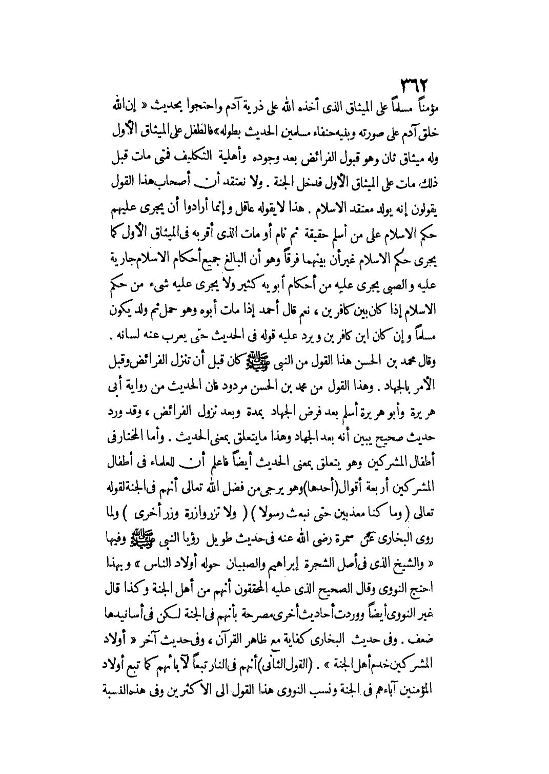 مُؤْمِنًا مُسْلِمًا عَلَى الْمِيثَاقِ الَّذِي أَخَذَهُ اللَّهُ عَلَى ذُرِّيَّةِ آدَمَ وَاحْتَجُّوا بِحَدِيثِ «إنَّ اللَّهَ خَلَقَ آدَمَ عَلَى صُورَتِهِ وَبَنِيهِ حُنَفَاءَ مُسْلِمِينَ» الْحَدِيثَ بِطُولِهِ فَالطِّفْلُ عَلَى الْمِيثَاقِ الْأَوَّلِ وَلَهُ مِيثَاقٌ ثَانٍ وَهُوَ قَبُولُ الْفَرَائِضِ بَعْدَ وُجُودِهِ وَأَهْلِيَّةِ التَّكْلِيفِ فَمَتَى مَاتَ قَبْلَ ذَلِكَ مَاتَ عَلَى الْمِيثَاقِ الْأَوَّلِ فَدَخَلَ الْجَنَّةَ وَلَا نَعْتَقِدُ أَنَّ أَصْحَابَ هَذَا الْقَوْلِ يَقُولُونَ إنَّهُ يُولَدُ مُعْتَقِدَ الْإِسْلَامِ هَذَا لَا يَقُولُهُ عَاقِلٌ وَإِنَّمَا أَرَادُوا أَنْ يَجْرِي عَلَيْهِمْ حُكْمُ الْإِسْلَامِ عَلَى مَنْ أَسْلَمَ حَقِيقَةً ثُمَّ نَامَ أَوْ مَاتَ الَّذِي أَقَرَّ بِهِ فِي الْمِيثَاقِ الْأَوَّلِ كَمَا يَجْرِي حُكْمُ الْإِسْلَامِ غَيْرَ أَنَّ بَيْنَهُمَا فَرْقًا وَهُوَ أَنَّ الْبَالِغَ جَمِيعُ أَحْكَامِ الْإِسْلَامِ جَارِيَةٌ عَلَيْهِ وَالصَّبِيُّ يَجْرِي عَلَيْهِ مِنْ أَحْكَامِ أَبَوَيْهِ كَثِيرٌ وَلَا يَجْرِي عَلَيْهِ شَيْءٌ مِنْ حُكْمِ الْإِسْلَامِ إذَا كَانَ بَيْنَ كَافِرَيْنِ.