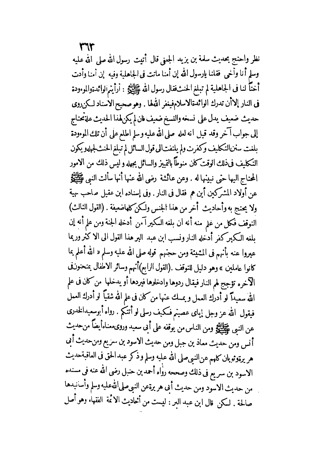 نَظَرٌ وَاحْتَجَّ بِحَدِيثِ «سَلَمَةَ بْنِ يَزِيدَ الْجُعْفِيِّ قَالَ أَتَيْت رَسُولَ اللَّهِ - صَلَّى اللَّهُ عَلَيْهِ وَسَلَّمَ - أَنَا وَأَخِي فَقُلْنَا يَا رَسُولَ اللَّهِ إنَّ أُمَّنَا مَاتَتْ فِي الْجَاهِلِيَّةِ» وَفِيهِ «إنَّ أُمَّنَا وَأَدَتْ أُخْتًا لَنَا فِي الْجَاهِلِيَّةِ لَمْ تَبْلُغْ الْحِنْثَ فَقَالَ رَسُولُ اللَّهِ - صَلَّى اللَّهُ عَلَيْهِ وَسَلَّمَ - أَرَأَيْتُمْ الْوَائِدَةَ وَالْمَوْءُودَةَ فِي النَّارِ إلَّا أَنْ تُدْرِكَ الْوَائِدَةُ الْإِسْلَامَ فَيَغْفِرُ اللَّهُ لَهَا» . وَهُوَ صَحِيحُ الْإِسْنَادِ لَكِنْ رُوِيَ حَدِيثٌ ضَعِيفٌ يَدُلُّ عَلَى نَسْخِهِ وَالنَّسْخُ ضَعِيفٌ فَإِنْ لَمْ يَكُنْ لِهَذَا الْحَدِيثِ عِلَّةٌ تَحْتَاجُ إلَى جَوَابٍ آخَرَ وَقَدْ قِيلَ: إنَّهُ لَعَلَّهُ - صَلَّى اللَّهُ عَلَيْهِ وَسَلَّمَ - اطَّلَعَ عَلَى أَنَّ تِلْكَ الْمَوْءُودَةَ بَلَغَتْ سِنَّ التَّكْلِيفِ وَكَفَرَتْ وَلَمْ يُلْتَفَتْ إلَى قَوْلِ السَّائِلِ لَمْ تَبْلُغْ الْحِنْثَ لِجَهْلِهِ وَيَكُونُ التَّكْلِيفُ فِي ذَلِكَ الْوَقْتِ كَانَ مَنُوطًا بِالتَّمْيِيزِ، وَالسَّائِلُ يَجْهَلُهُ وَلَيْسَ ذَلِكَ مِنْ الْأُمُورِ الْمُحْتَاجِ إلَيْهَا حَتَّى نُبَيِّنَهَا لَهُ.