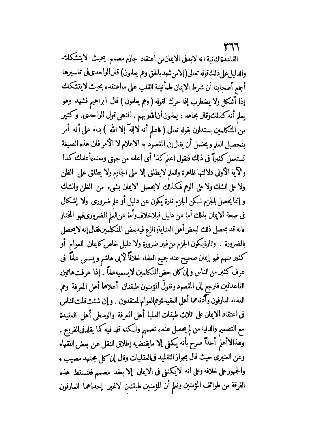 الْقَاعِدَةُ الثَّانِيَةُ. أَنَّهُ لَا بُدَّ فِي الْإِيمَانِ مِنْ اعْتِقَادٍ جَازِمٍ مُصَمَّمٍ بِحَيْثُ لَا يَتَشَكَّكُ، وَالدَّلِيلُ عَلَى ذَلِكَ قَوْله تَعَالَى {إِلا مَنْ شَهِدَ بِالْحَقِّ وَهُمْ يَعْلَمُونَ} [الزخرف: 86] قَالَ الْوَاحِدِيُّ فِي تَفْسِيرِهَا: أَجْمَعَ أَصْحَابُنَا أَنَّ شَرْطَ الْإِيمَانِ طُمَأْنِينَةُ الْقَلْبِ عَلَى مَا اعْتَقَدَهُ بِحَيْثُ لَا يَتَشَكَّكُ إذَا أُشْكِلَ وَلَا يَضْطَرِبُ إذَا حُرِّكَ لِقَوْلِهِ {وَهُمْ يَعْلَمُونَ} [الزخرف: 86] قَالَ إبْرَاهِيمُ فَشَهِدَ وَهُوَ يَعْلَمُ أَنَّهُ كَذَلِكَ وَقَالَ مُجَاهِدٌ: يَعْلَمُونَ أَنَّ اللَّهَ رَبُّهُمْ. انْتَهَى قَوْلُ الْوَاحِدِيِّ.