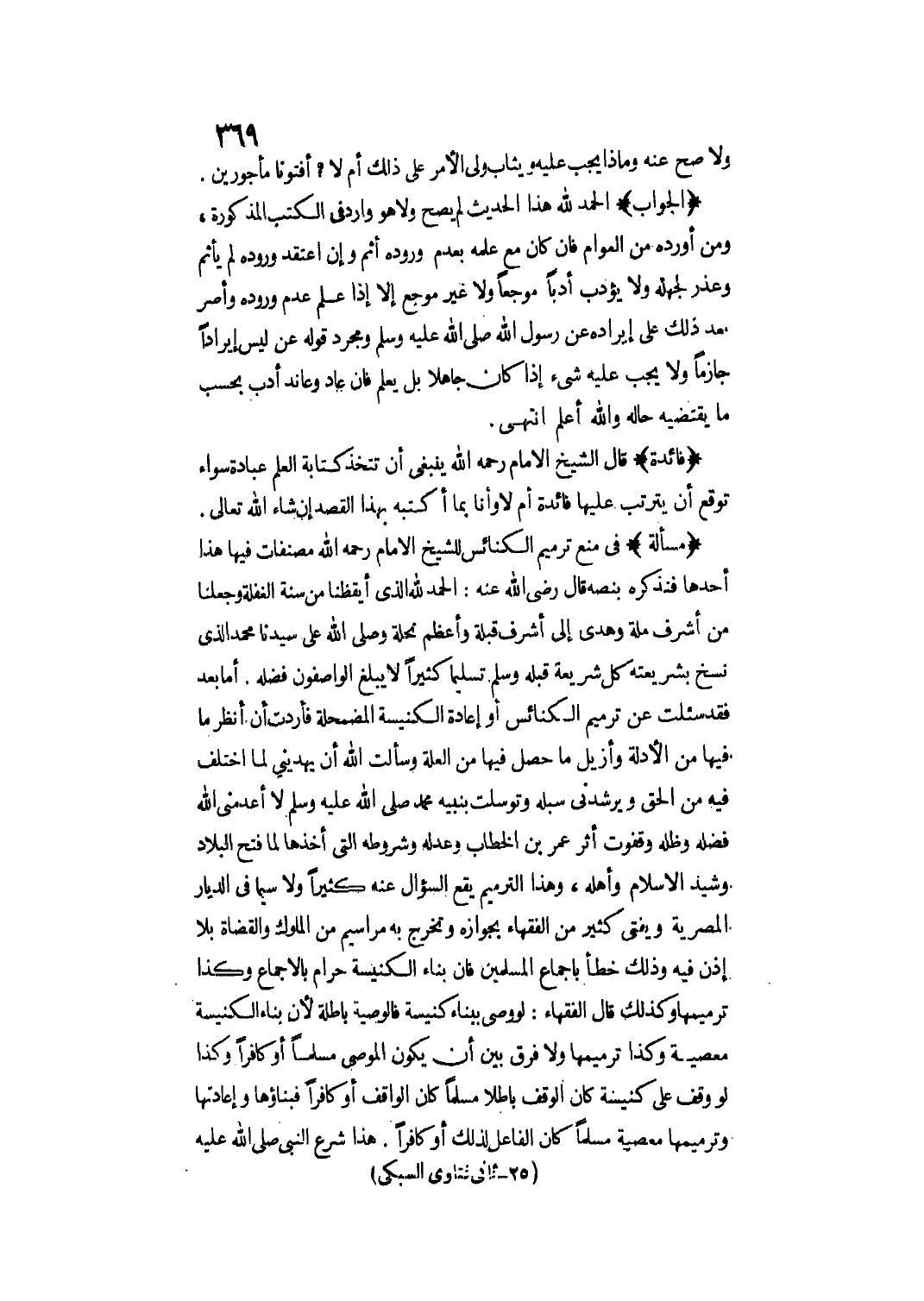 (مَسْأَلَةٌ) فِي مَنْعِ تَرْمِيمِ الْكَنَائِسِ لِلشَّيْخِ الْإِمَامِ - رَحِمَهُ اللَّهُ - مُصَنَّفَاتٌ فِيهَا هَذَا: أَحَدُهَا فَنَذْكُرُهُ بِنَصِّهِ قَالَ - رَضِيَ اللَّهُ عَنْهُ -: الْحَمْدُ لِلَّهِ الَّذِي أَيْقَظَنَا مِنْ سِنَةِ الْغَفْلَةِ وَجَعَلَنَا مِنْ أَشْرَفِ مِلَّةٍ وَهَدَى إلَى أَشْرَفِ قِبْلَةٍ وَأَعْظَمِ نِحْلَةٍ وَصَلَّى اللَّهُ عَلَى سَيِّدِنَا مُحَمَّدٍ الَّذِي نَسَخَ بِشَرِيعَتِهِ كُلَّ شَرِيعَةٍ قَبْلَهُ وَسَلِّمْ تَسْلِيمًا كَثِيرًا لَا يَبْلُغُ الْوَاصِفُونَ فَضْلَهُ.