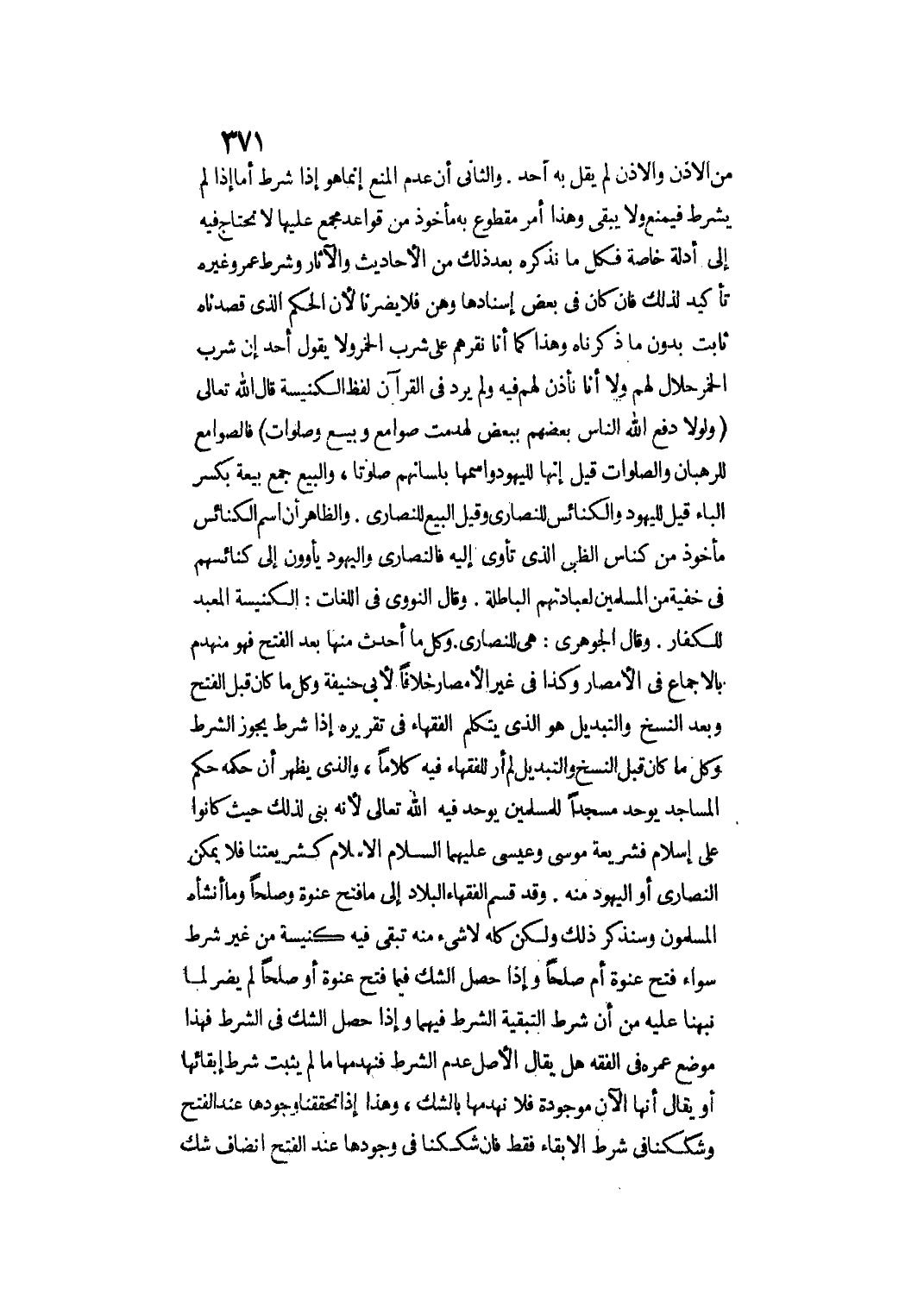 وَالثَّانِي أَنَّ عَدَمَ الْمَنْعِ إنَّمَا هُوَ إذَا شُرِطَ أَمَّا إذَا لَمْ يُشْرَطْ فَيُمْنَعُ وَلَا يَبْقَى وَهَذَا أَمْرٌ مَقْطُوعٌ بِهِ مَأْخُوذٌ مِنْ قَوَاعِدَ مُجْمَعٍ عَلَيْهَا لَا نَحْتَاجُ فِيهِ إلَى أَدِلَّةٍ خَاصَّةٍ فَكُلُّ مَا نَذْكُرُهُ بَعْدَ ذَلِكَ مِنْ الْأَحَادِيثِ وَالْآثَارِ وَشَرْطِ عُمَرَ وَغَيْرِهِ تَأْكِيدٌ لِذَلِكَ فَإِنْ كَانَ فِي بَعْضِ إسْنَادِهَا وَهْنٌ فَلَا يَضُرُّنَا؛ لِأَنَّ الْحُكْمَ الَّذِي قَصَدْنَاهُ ثَابِتٌ بِدُونِ مَا ذَكَرْنَاهُ وَهَذَا كَمَا أَنَّا نُقِرُّهُمْ عَلَى شُرْبِ الْخَمْرِ وَلَا يَقُولُ أَحَدٌ إنَّ شُرْبَ الْخَمْرِ حَلَالٌ لَهُمْ وَلَا أَنَّا نَأْذَنُ لَهُمْ فِيهِ وَلَمْ يَرِدْ فِي الْقُرْآنِ لَفْظُ الْكَنِيسَةِ.