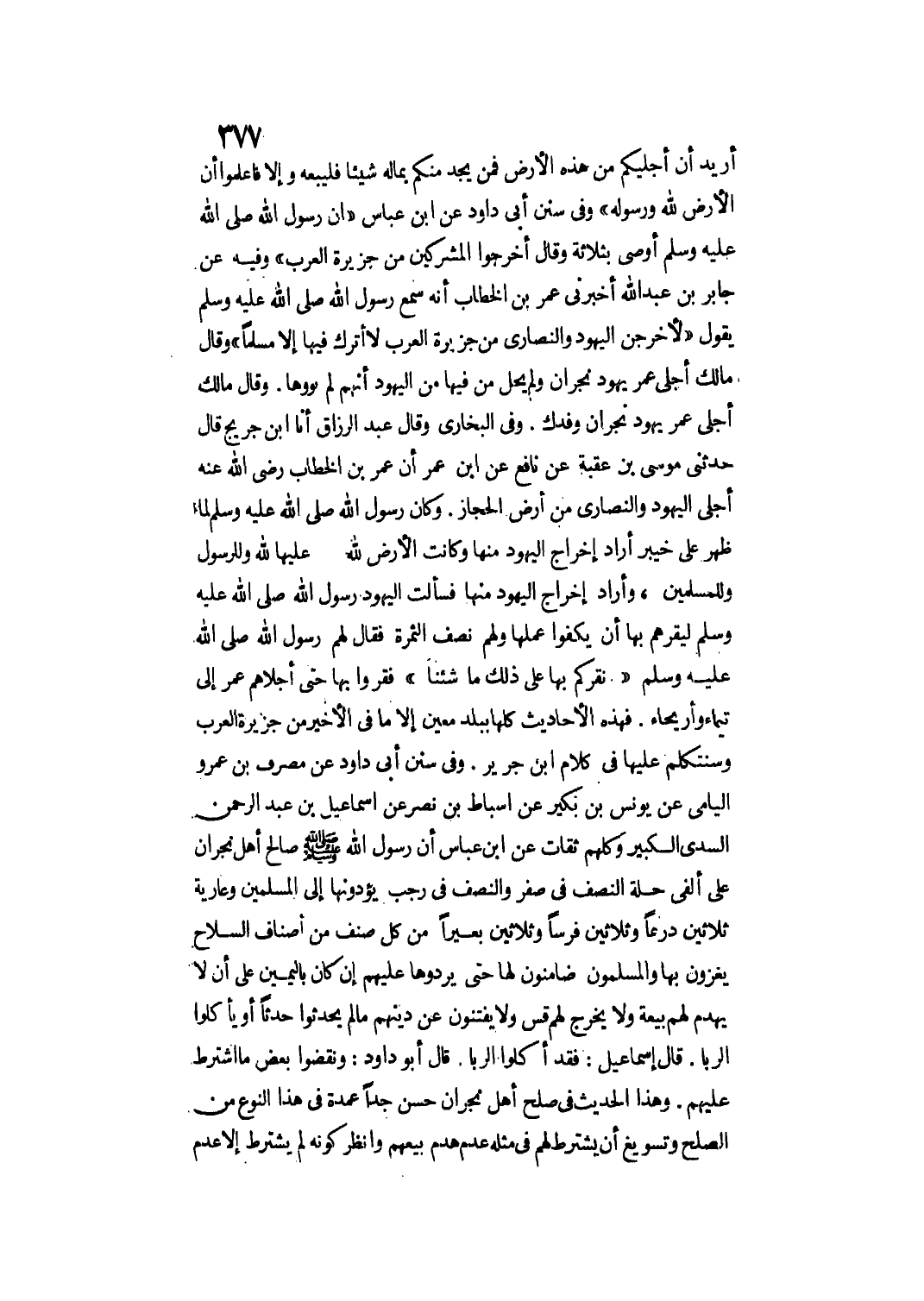 أُرِيدُ أَنْ أُجْلِيَكُمْ مِنْ هَذِهِ الْأَرْضِ فَمَنْ يَجِدْ مِنْكُمْ بِمَالِهِ شَيْئًا فَلْيَبِعْهُ وَإِلَّا فَاعْلَمُوا أَنَّ الْأَرْضَ لِلَّهِ وَرَسُولِهِ» وَفِي سُنَنِ أَبِي دَاوُد عَنْ ابْنِ عَبَّاسٍ «أَنَّ رَسُولَ اللَّهِ - صَلَّى اللَّهُ عَلَيْهِ وَسَلَّمَ - أَوْصَى بِثَلَاثَةٍ وَقَالَ: أَخْرِجُوا الْمُشْرِكِينَ مِنْ جَزِيرَةِ الْعَرَبِ» وَفِيهِ عَنْ جَابِرِ بْنِ عَبْدِ اللَّهِ أَخْبَرَنِي عُمَرُ بْنُ الْخَطَّابِ أَنَّهُ سَمِعَ رَسُولَ اللَّهِ - صَلَّى اللَّهُ عَلَيْهِ وَسَلَّمَ - يَقُولُ «لَأُخْرِجَنَّ الْيَهُودَ وَالنَّصَارَى مِنْ جَزِيرَةِ الْعَرَبِ لَا أَتْرُكُ فِيهَا إلَّا مُسْلِمًا» .